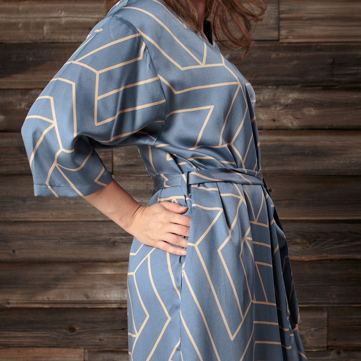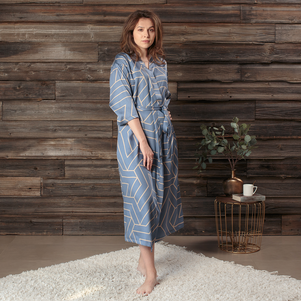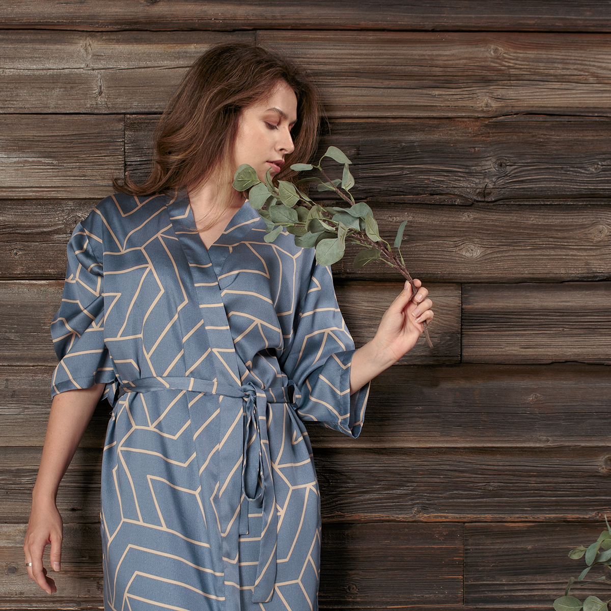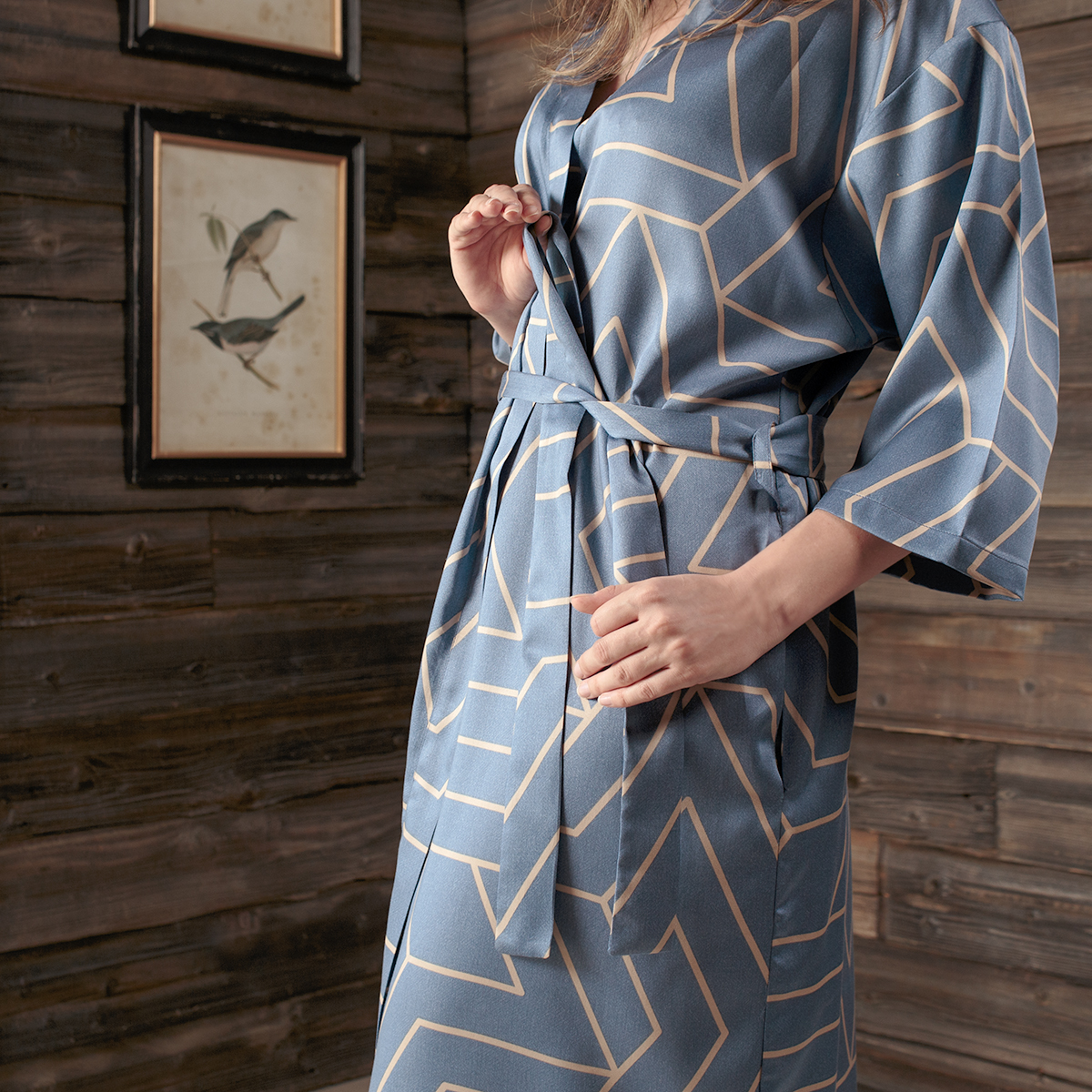 Модель: халат-кимоно, завязывается поясом на запах, имеет внутренние завязки и карманы в швах