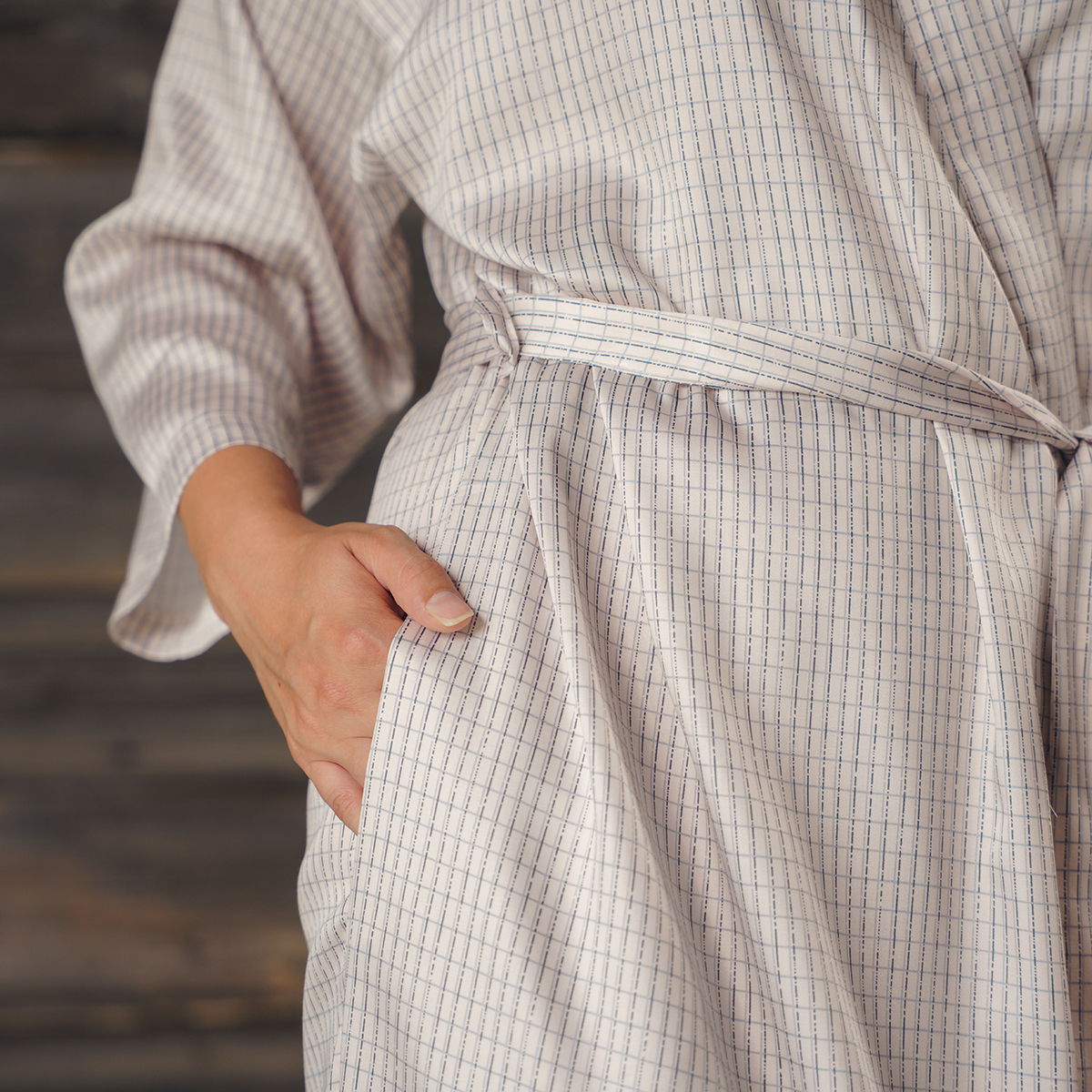 Модель: халат-кимоно, завязывается поясом на запах, имеет внутренние завязки и карманы в швах