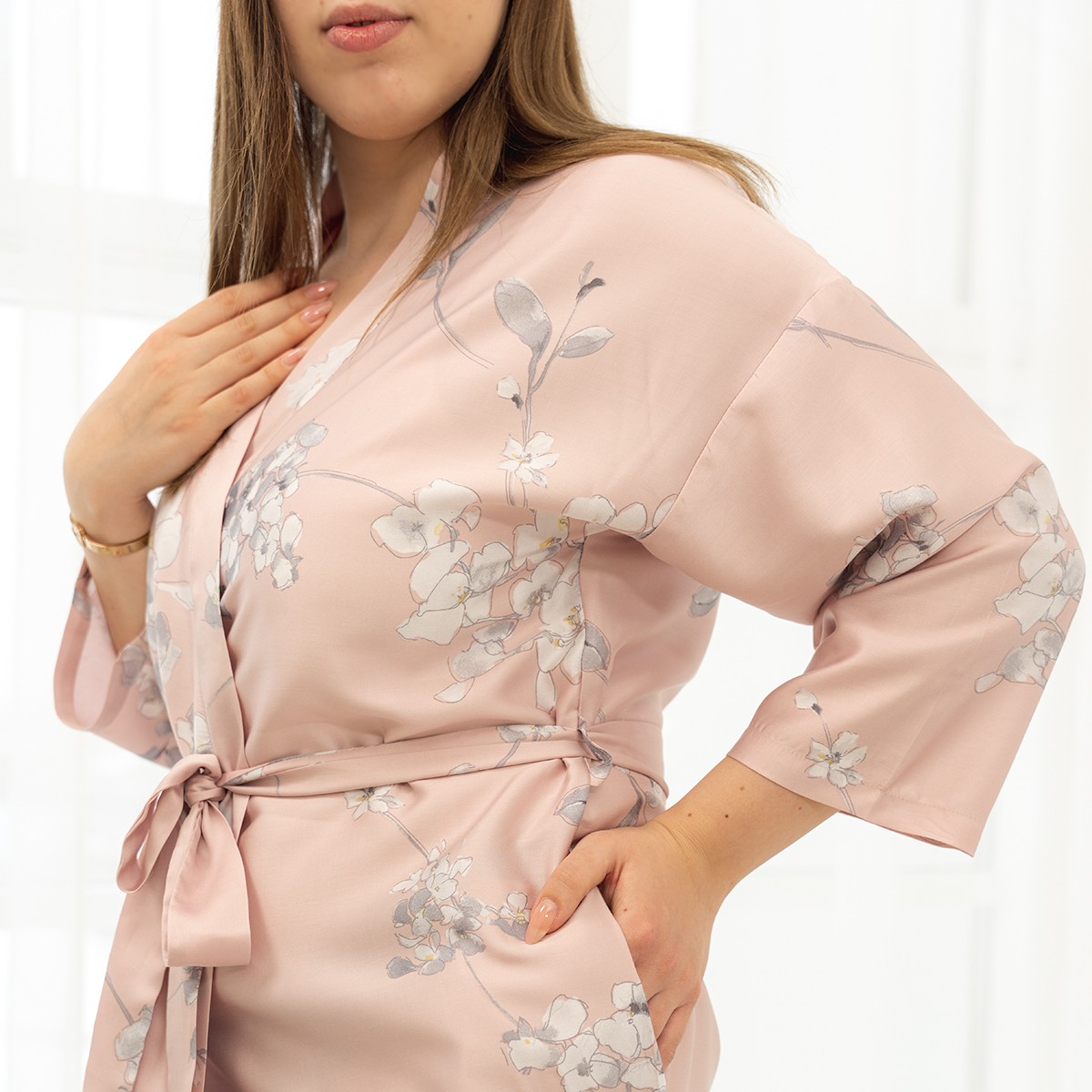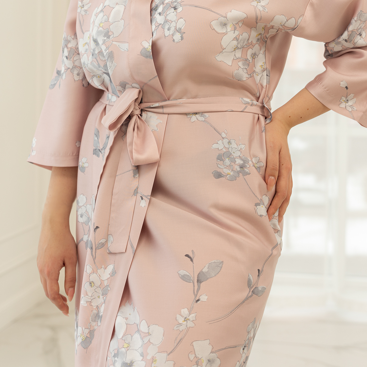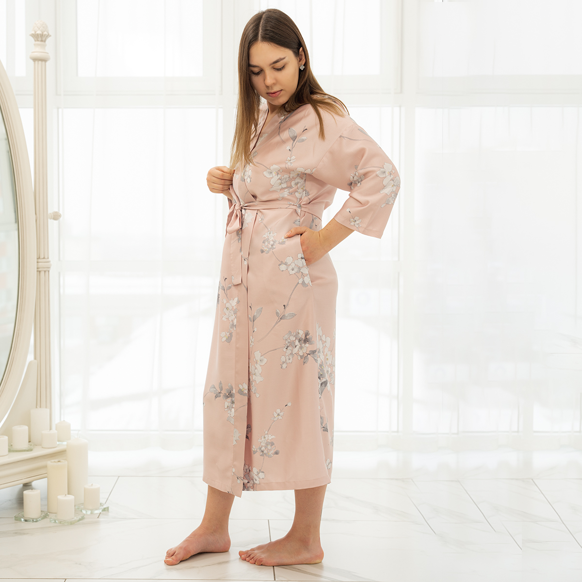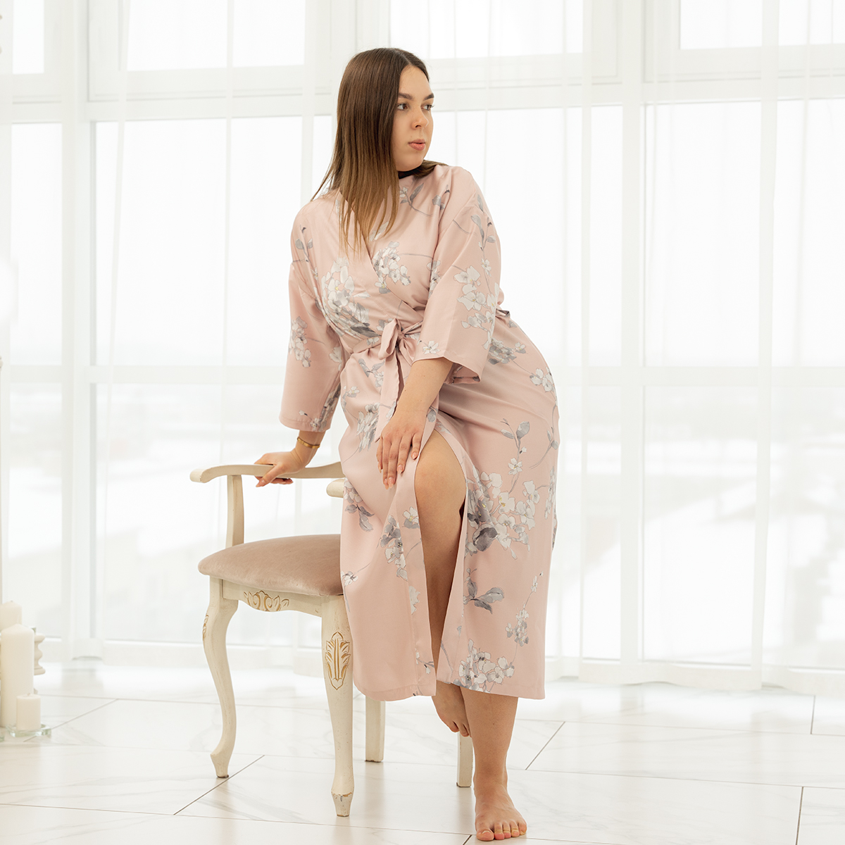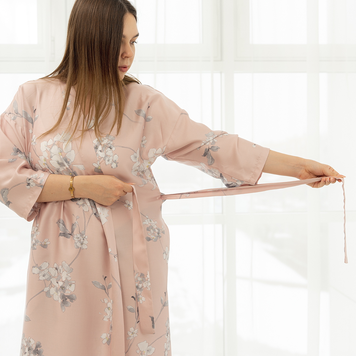 Модель: халат-кимоно, завязывается поясом на запах, имеет внутренние завязки и карманы в швах