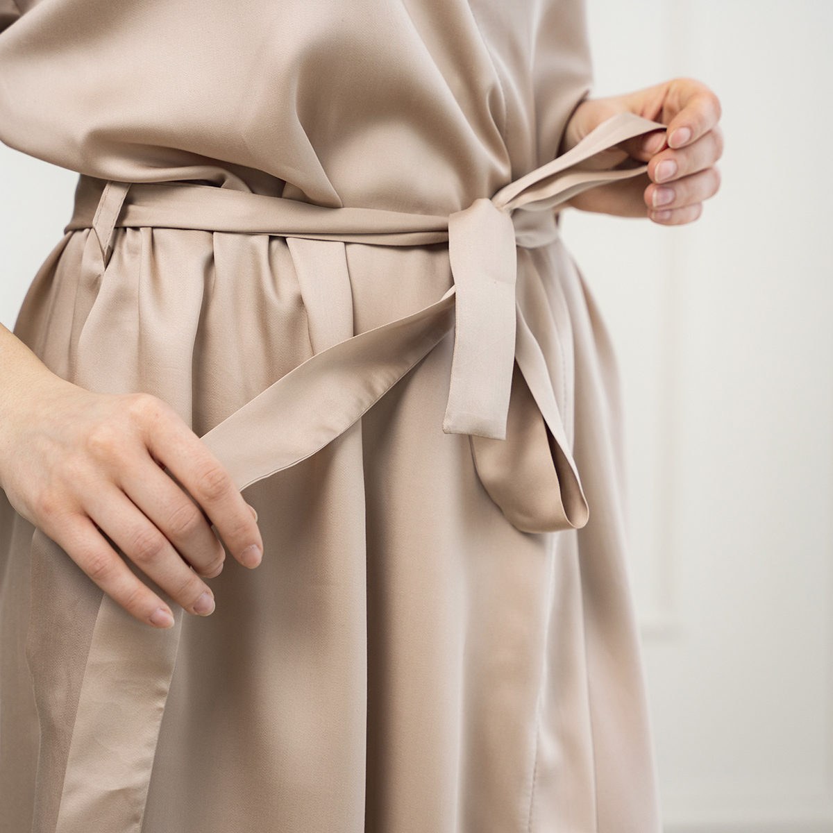Модель: халат-кимоно, завязывается поясом на запах, имеет внутренние завязки и карманы в швах