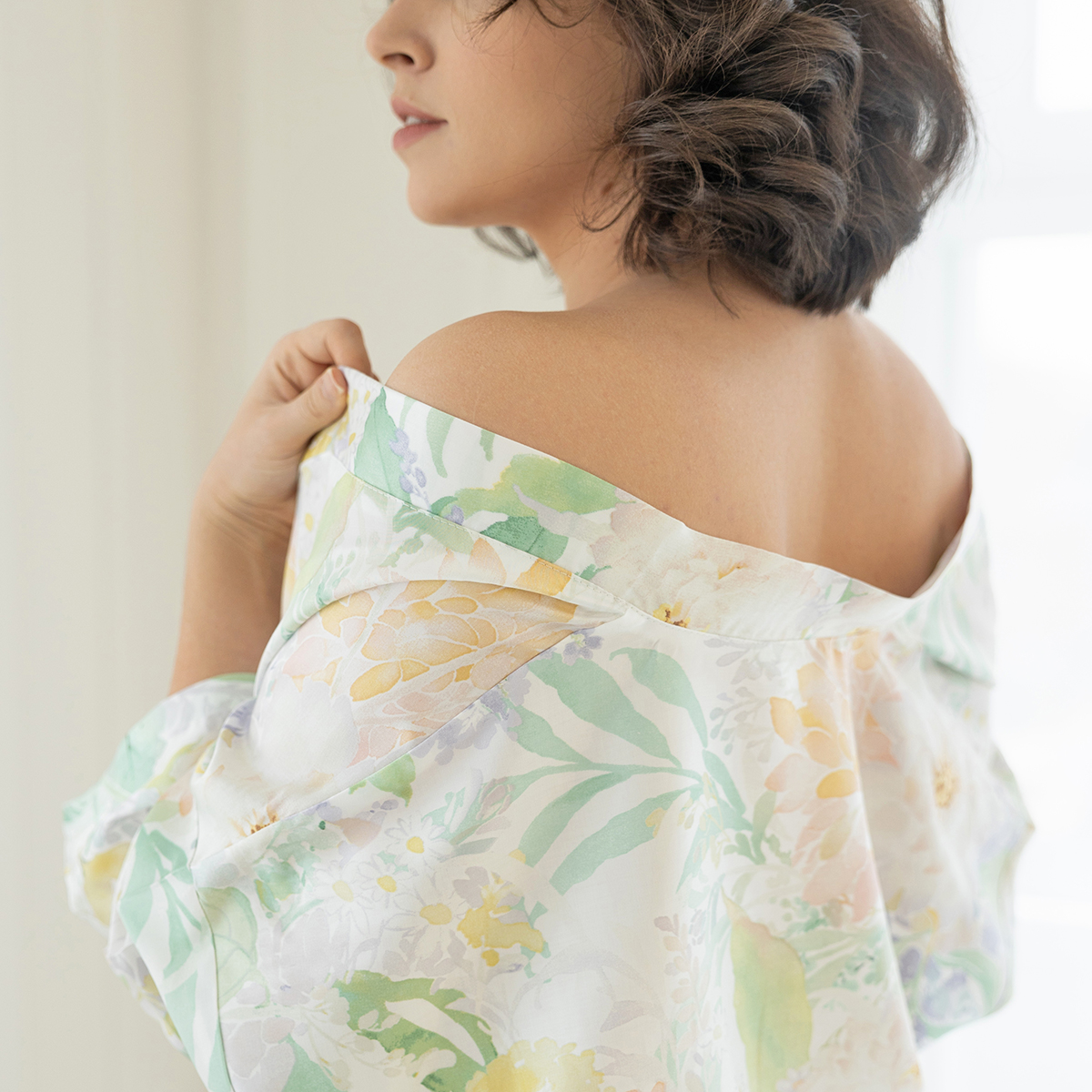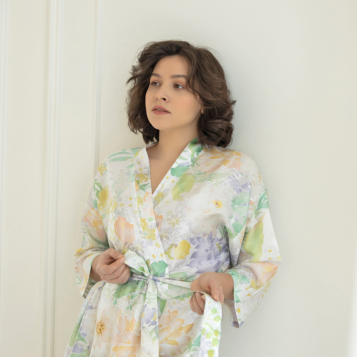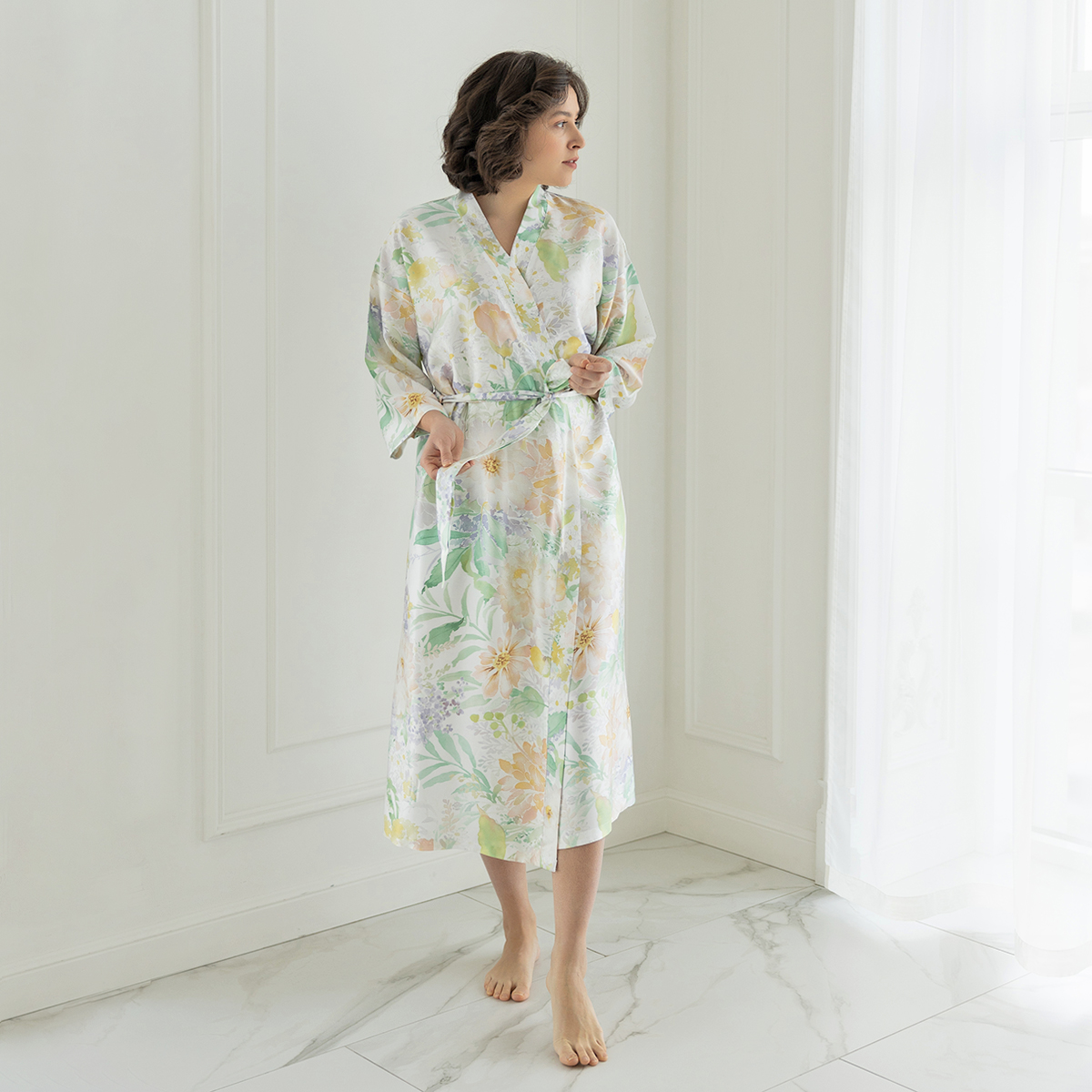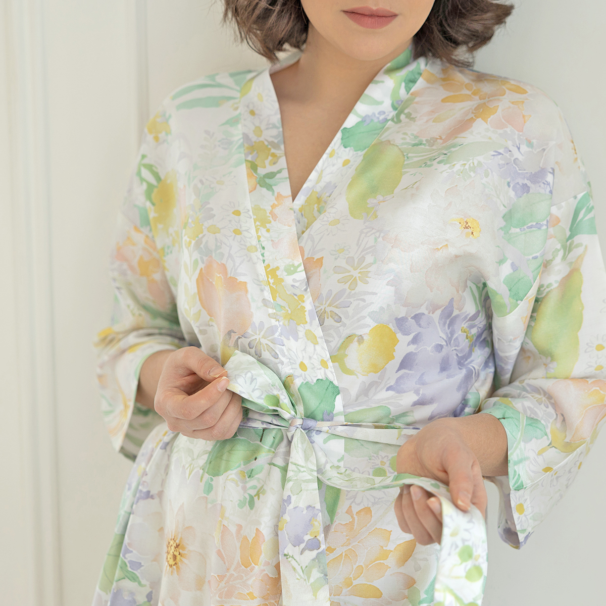 Модель: халат-кимоно, завязывается поясом на запах, имеет внутренние завязки и карманы в швах