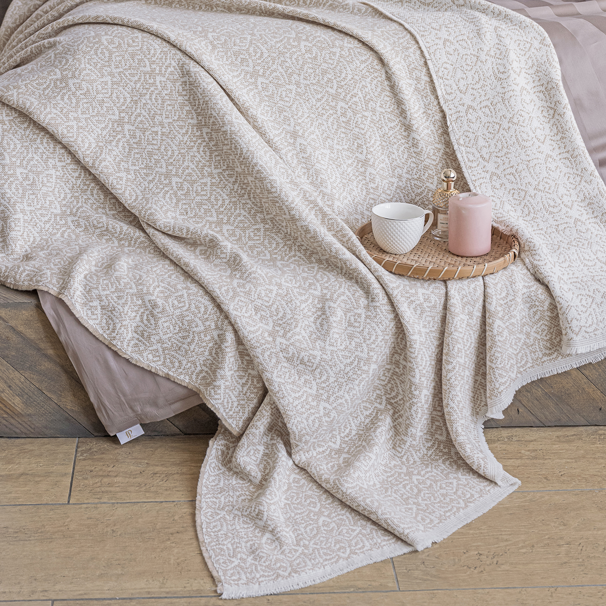 Плед декорирован лентой и фирменным вкладышем.