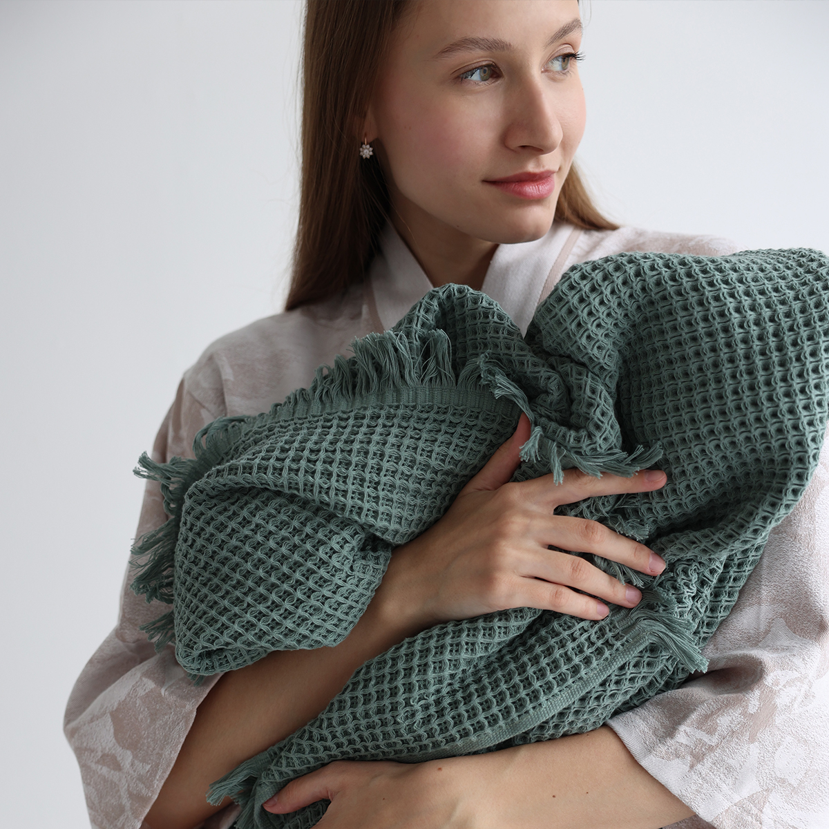 Высококачественная натуральная пряжа делает плед мягким и комфортным на ощупь. Оригинальная объемная фактура добавляет особую изысканность пледу.