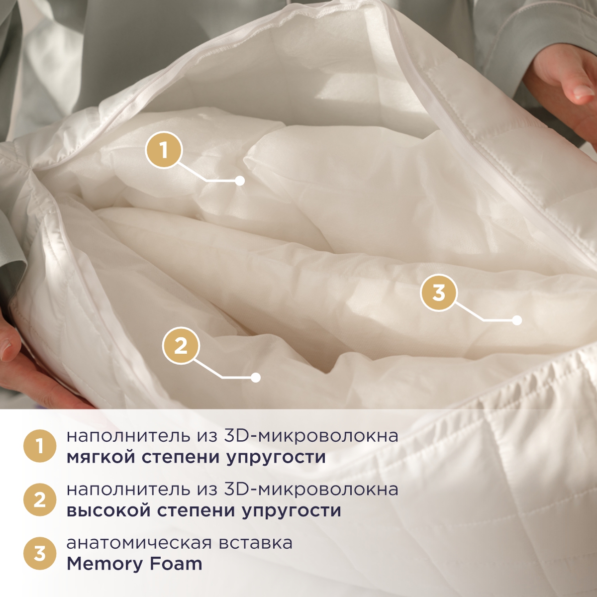 - Внутренняя камера подушки специальная анатомическая вставка Memory foam – это эластичный пенополиуретан с эффектом памяти, который обеспечивает комфортную поддержку голове и снимает напряжение с шеи.