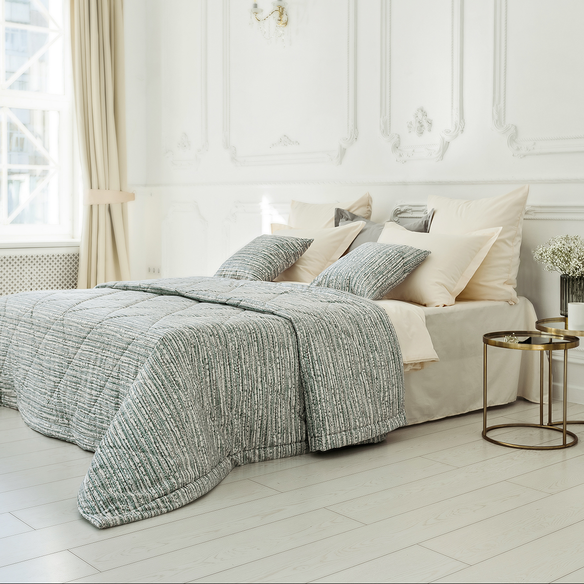 - Надёжность и практичность: покрывало выполнено с ромбовидной стёжкой, которая не только придаёт ему стильный вид, но и гарантирует, что оно будет сохранять свою форму и не давать усадку даже после долгого использования. А подклад из микрофибры велюр предотвращает скольжение на кровати.