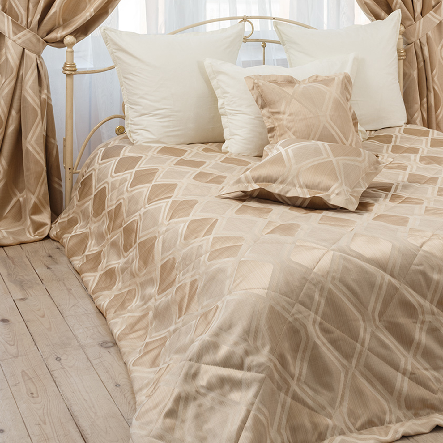 Оригинальный геометричный орнамент привносит особый ритм и стиль в интерьер, а утонченные молочные оттенки уравновешивают, дарят спокойствие и безмятежность ночных сновидений.