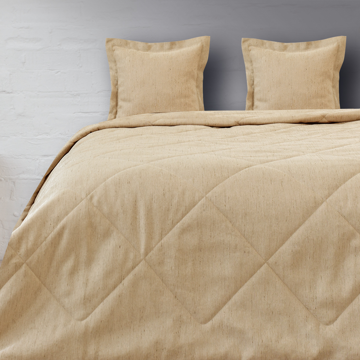 В комплект входит: стеганное покрывало на подкладе размер 240*260 см и 2 декоративные наволочки 50х70 см на молнии. Наволочки с четырех сторон декорированы ушками шириной 4 см.