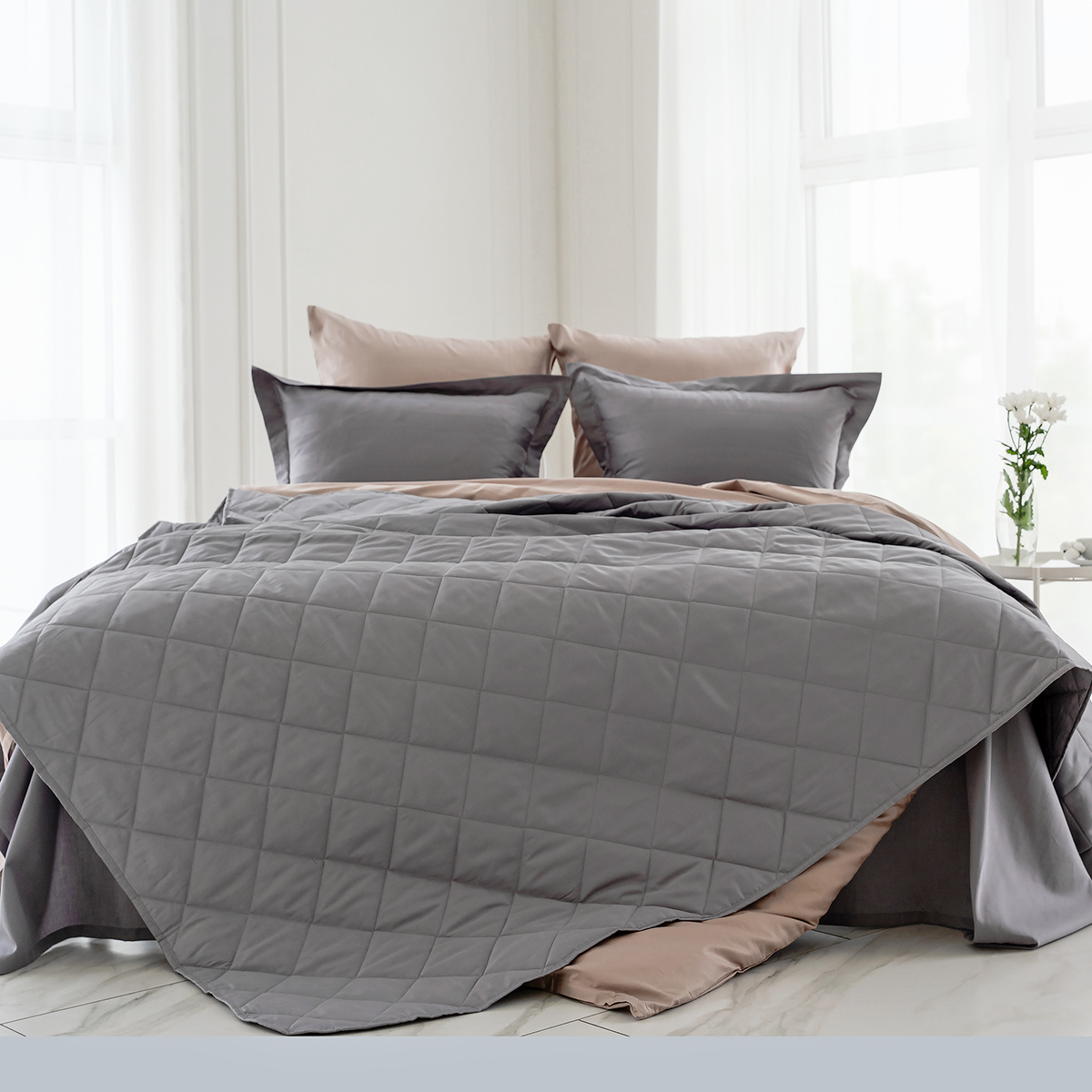 Стеганое покрывало многофункционально: его можно использовать как покрывало для декорирования кровати, так и как легкое одеяло. Покрывало простегано тонким слоем гипоаллергенного наполнителя.