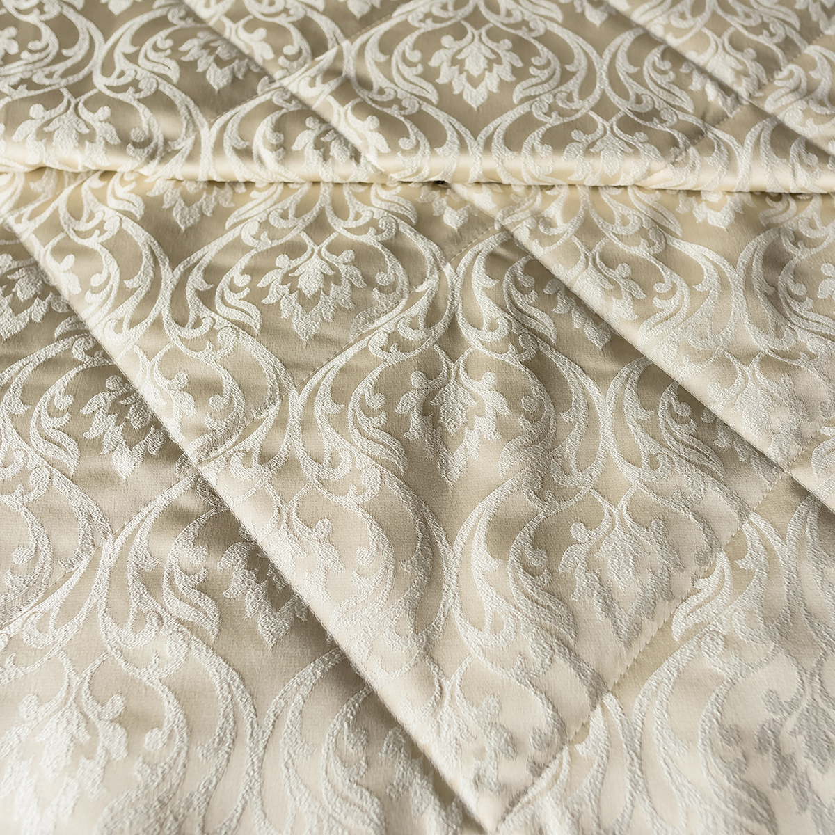 Состав: ткань портьерная 100% пэ, наполнитель - полиэфирное волокно. Стежка в виде ромбов. Подклад покрывала – микрофибра велюр, за счет своей фактуры он предотвращает скольжение покрывала на кровати.