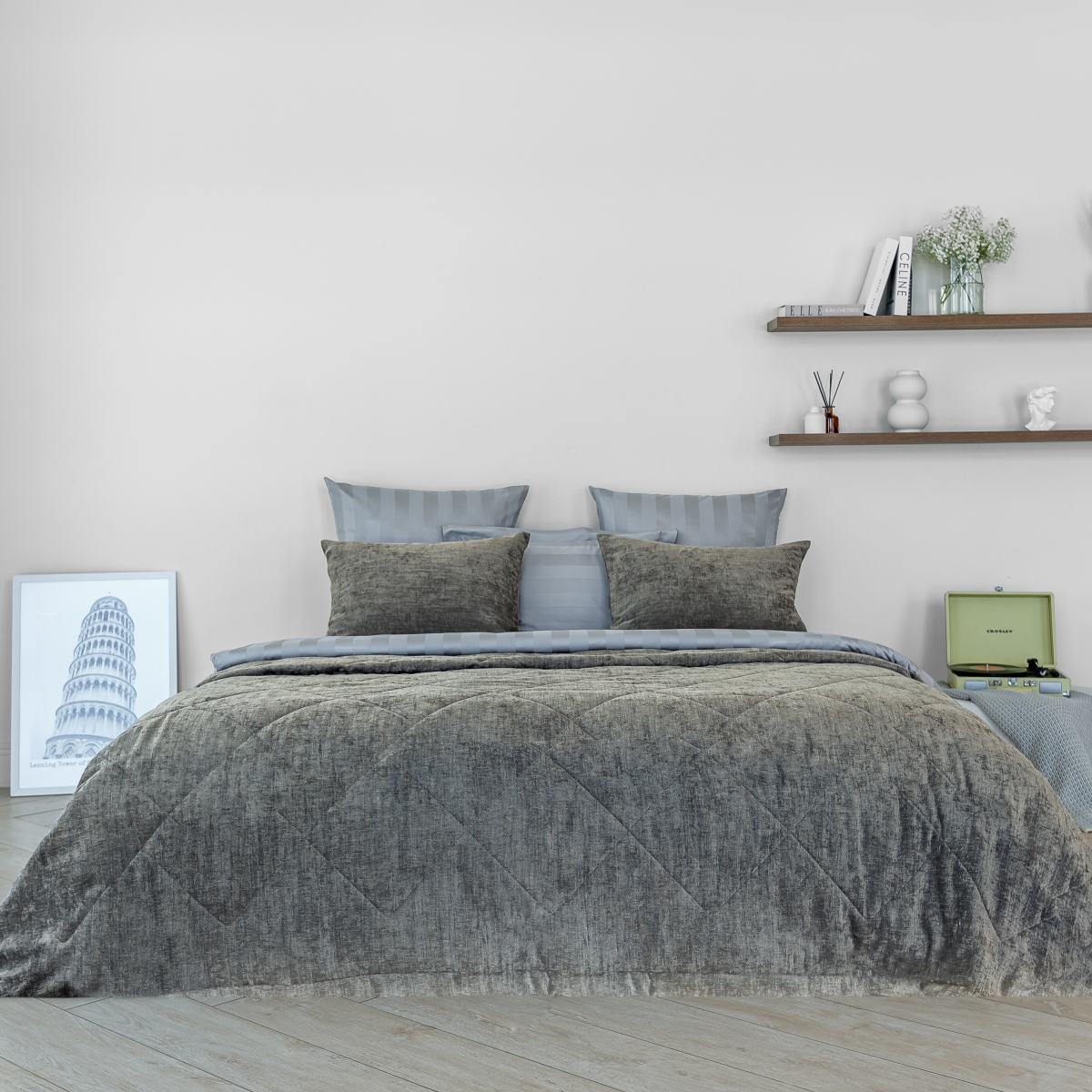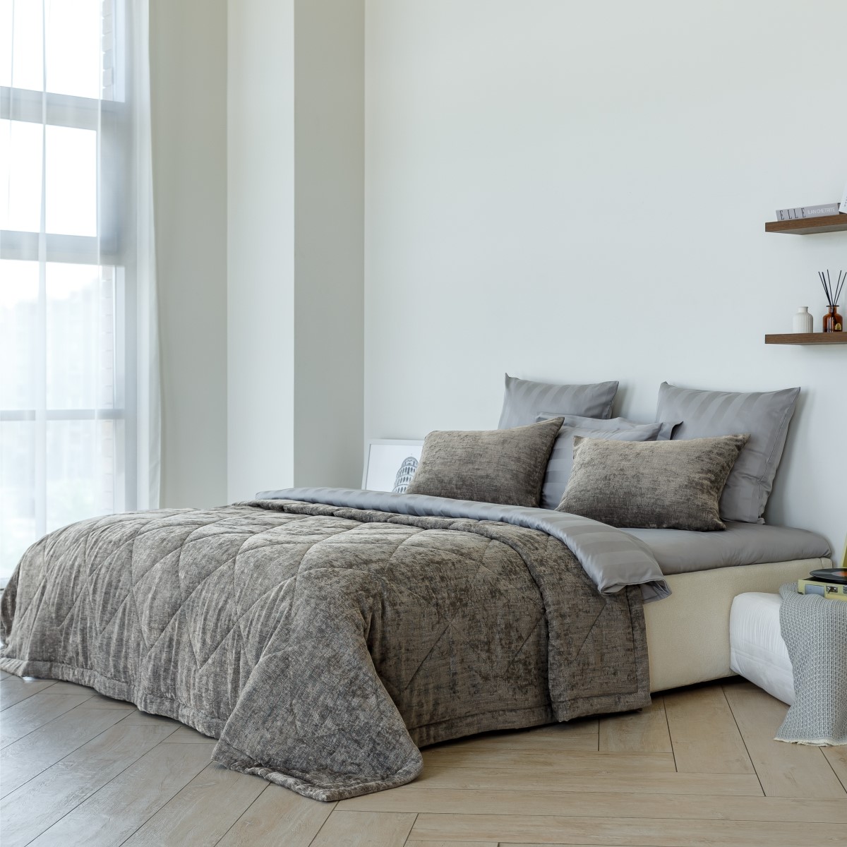 Выразительная игра света и мягкости гармонично воплощена в роскошной коллекции покрывал, она будто преобразует пространство, придавая ему благородный шик.