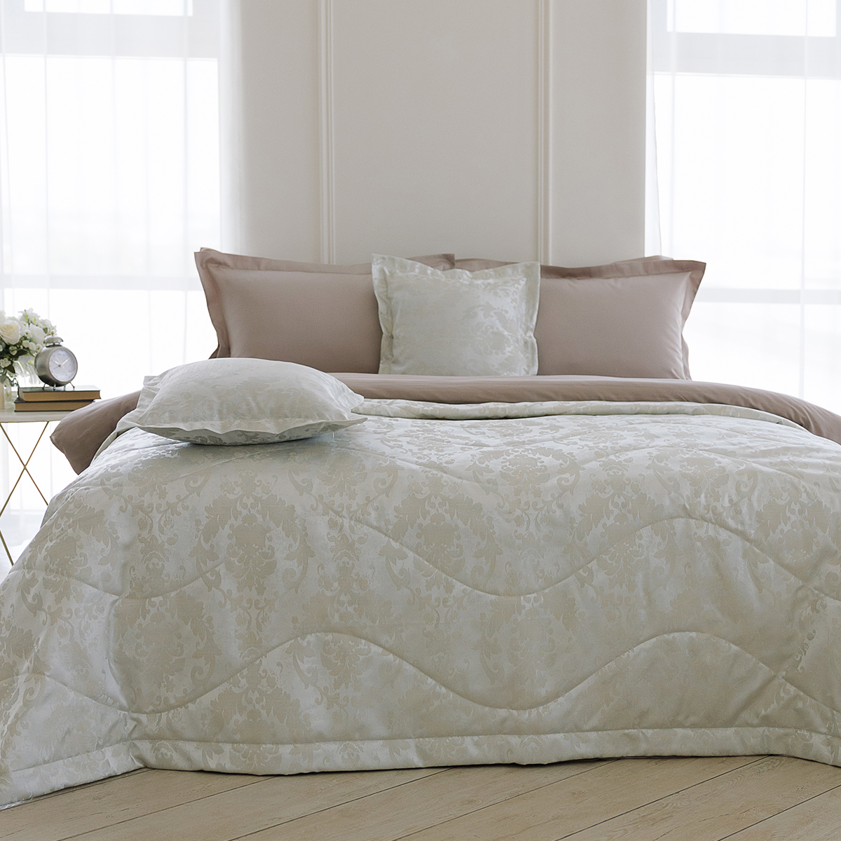 В комплект входит: стеганое покрывало на подкладе размер 240х260 см и 2 декоративные наволочки 45х45 см на молнии. Наволочки с четырех сторон декорированы ушками шириной 4 см.