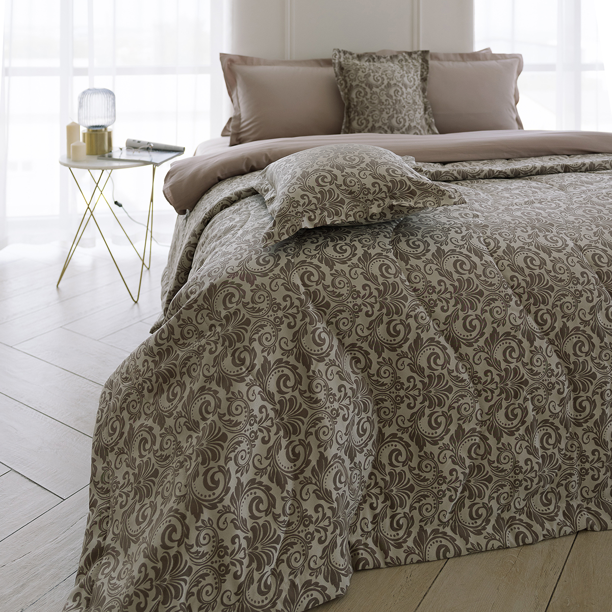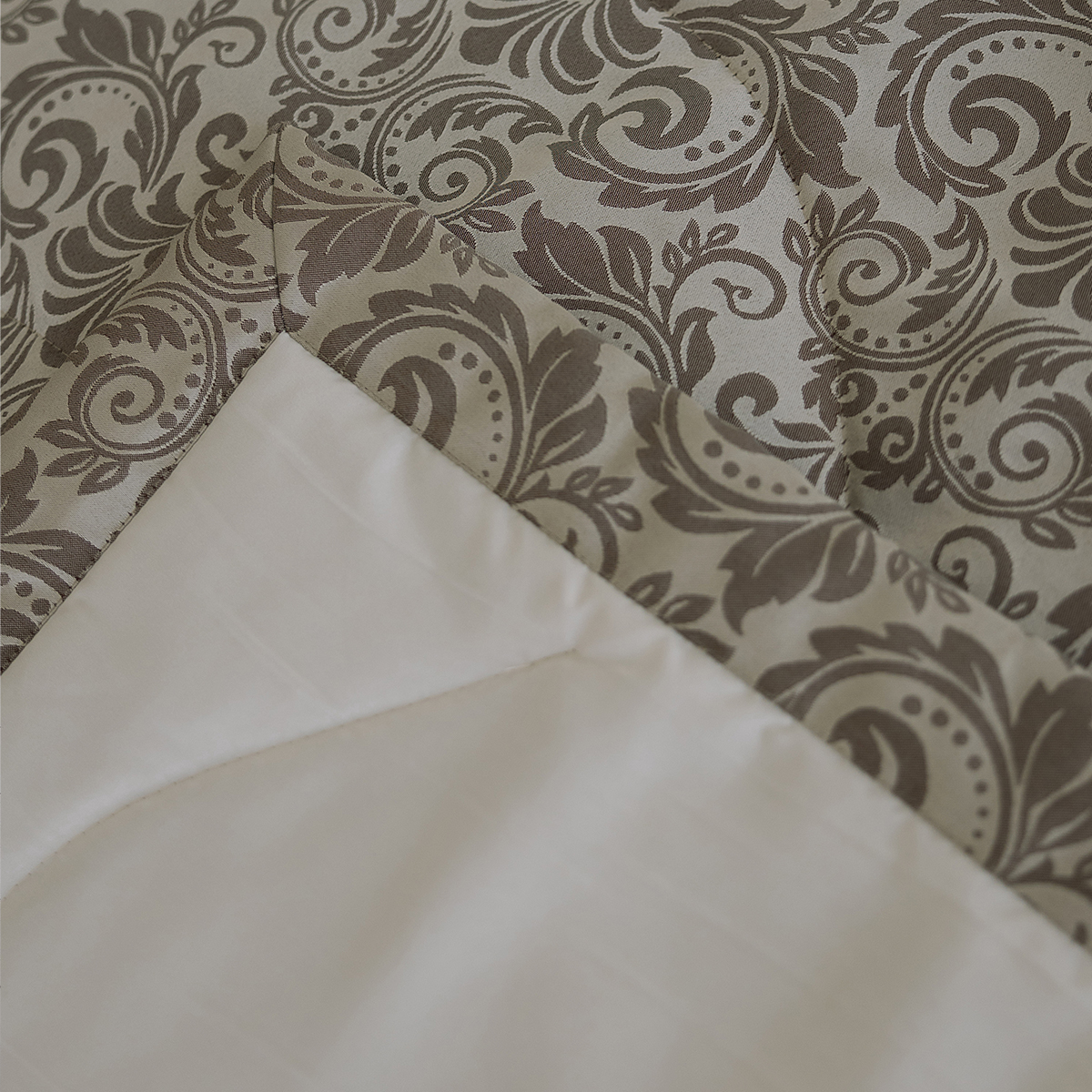 В комплект входит: стеганое покрывало на подкладе размер 240х260 см и 2 декоративные наволочки 45х45 см на молнии. Наволочки с четырех сторон декорированы ушками шириной 4 см.