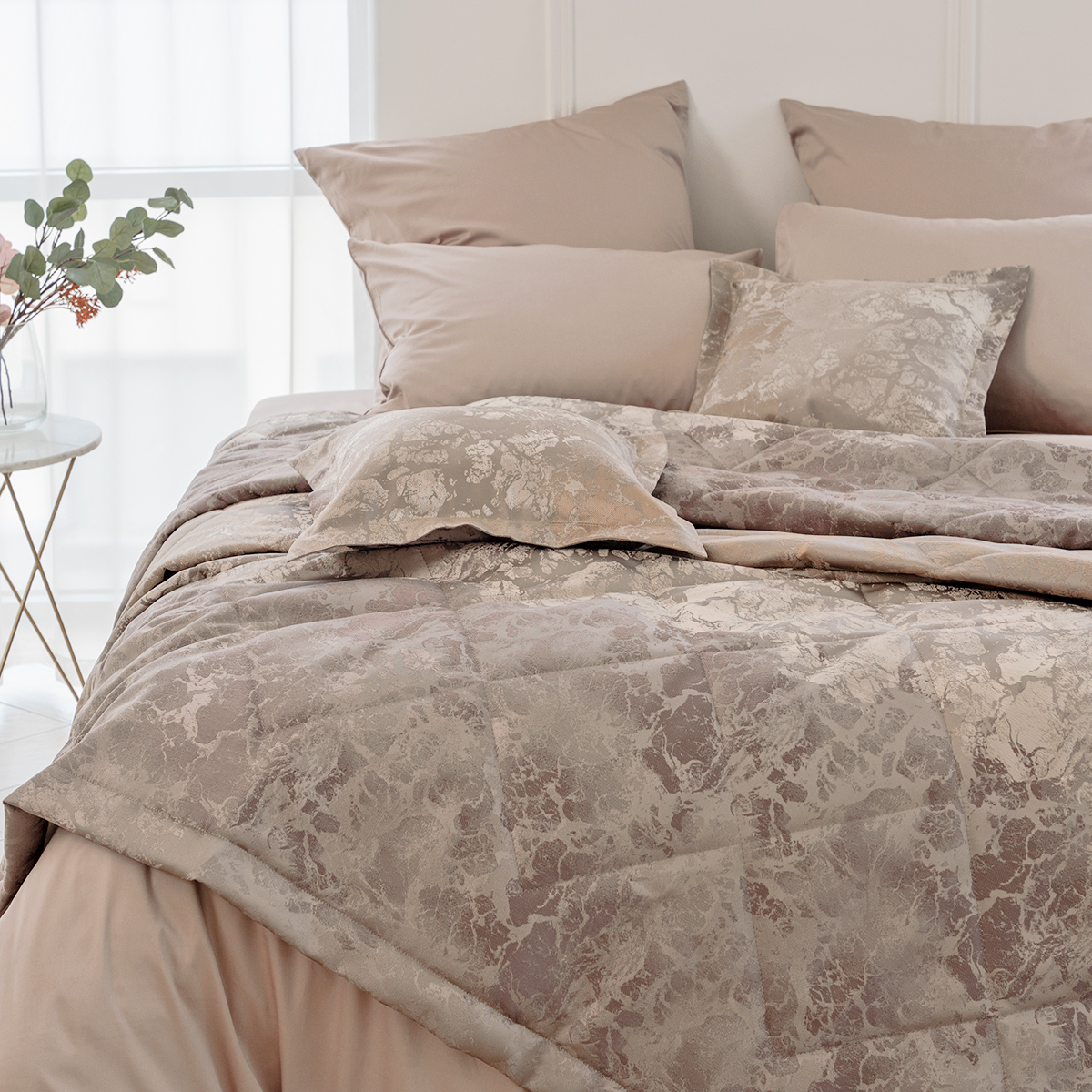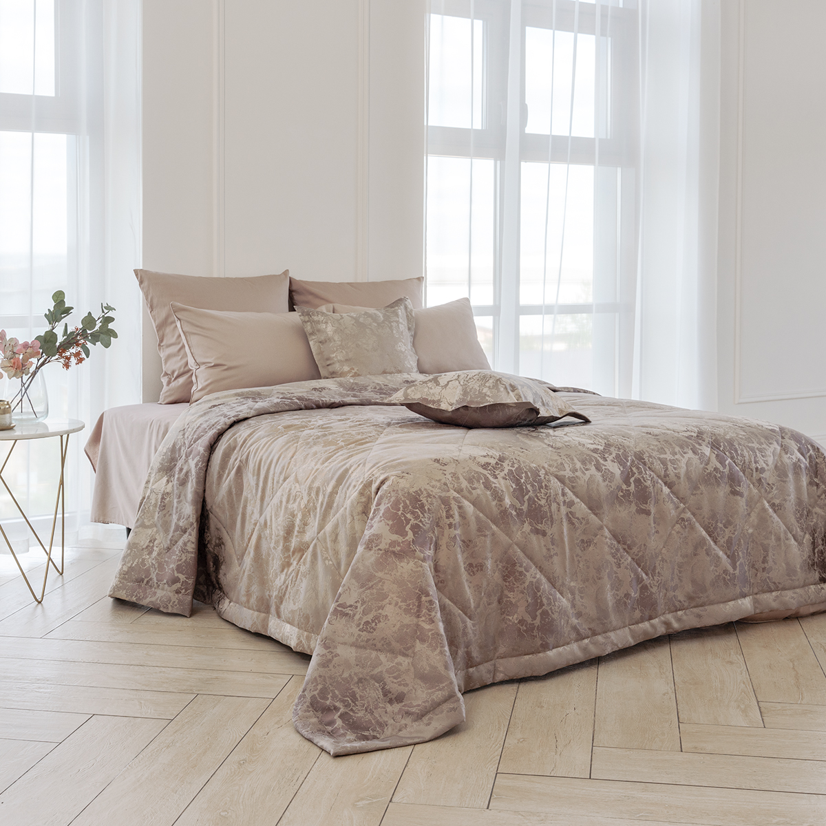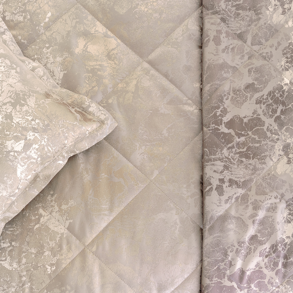 Состав: ткань портьерная 100% пэ, наполнитель - полиэфирное волокно. Стежка в виде ромбов. Подклад покрывала – микрофибра велюр, за счет своей фактуры он предотвращает скольжение покрывала на кровати.