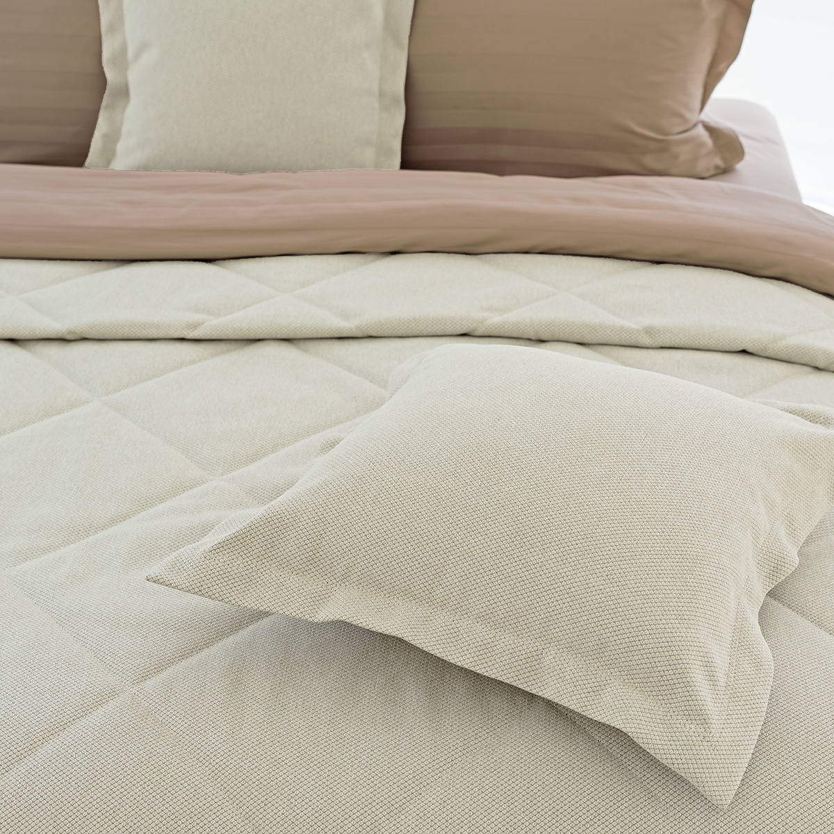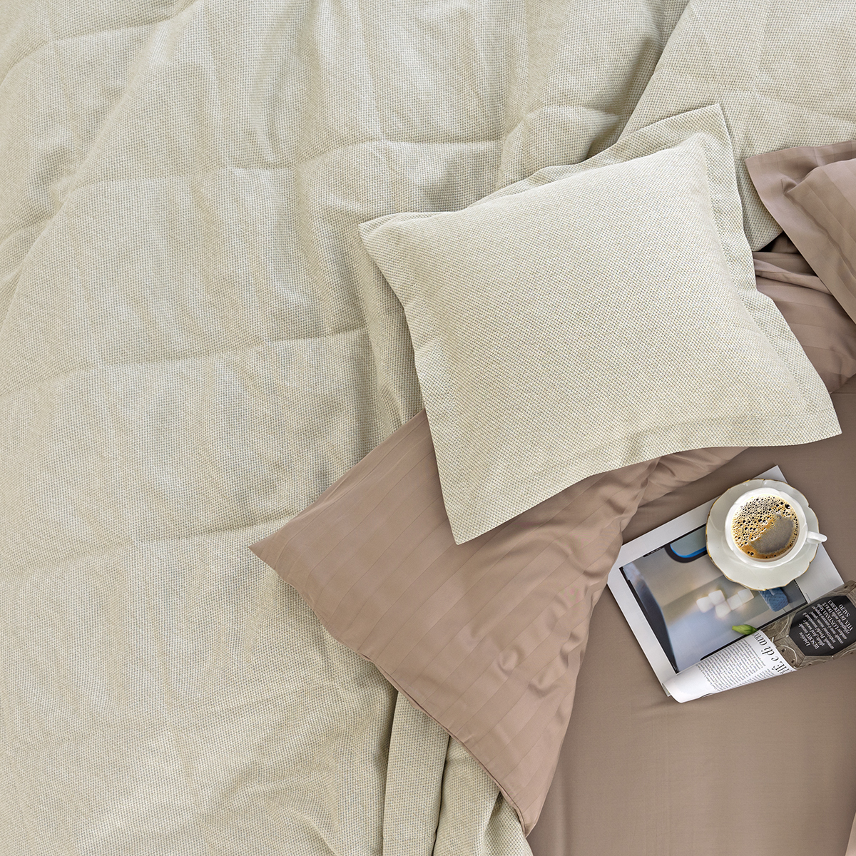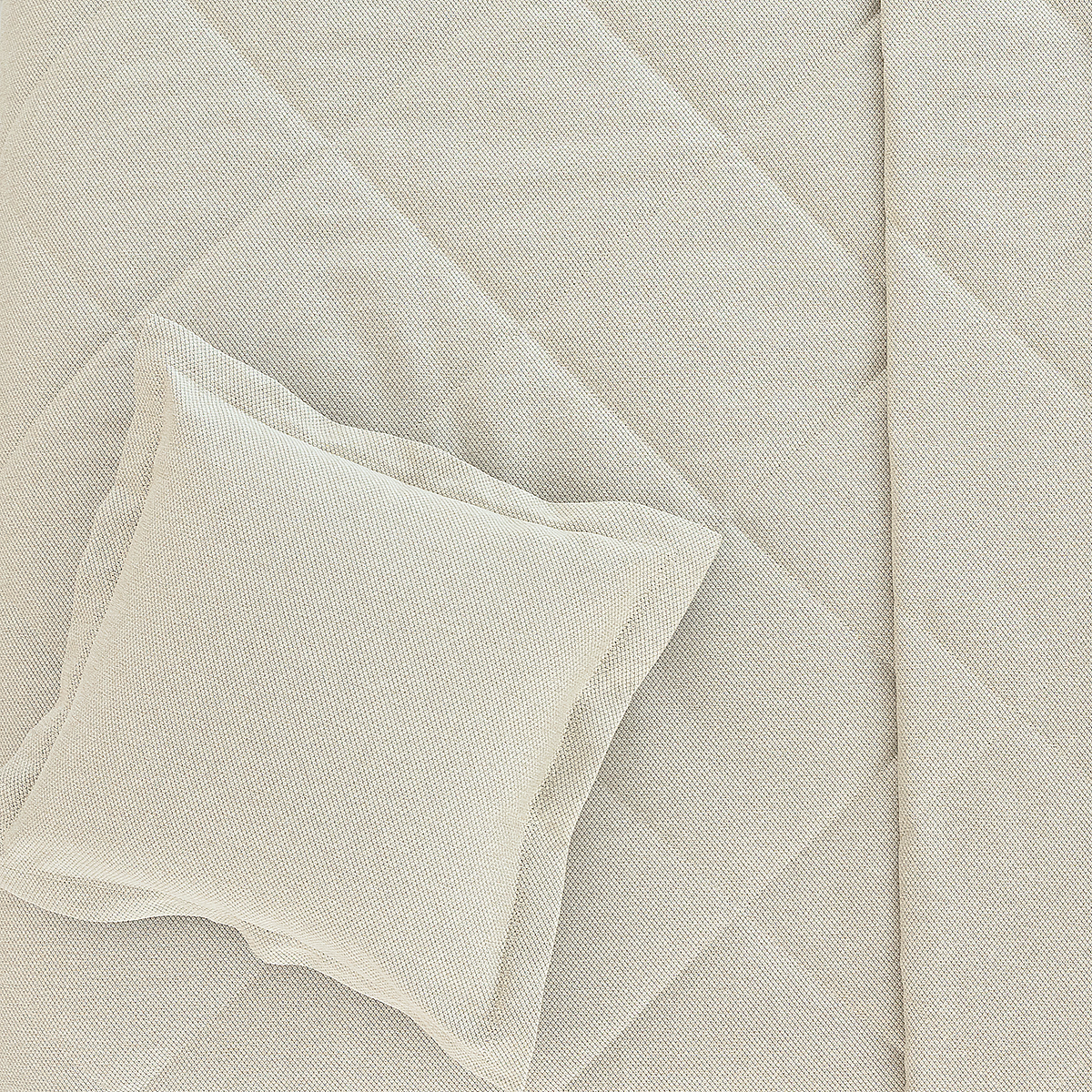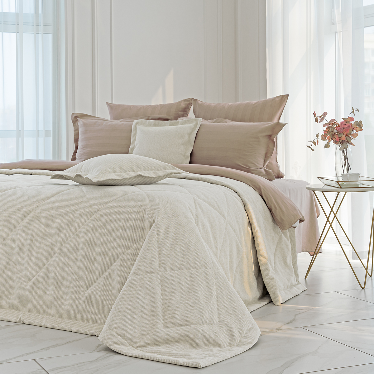 В комплект входит: стеганое покрывало на подкладе размер 240х260 см и 2 декоративные наволочки 45х45 см на молнии. Наволочки с четырех сторон декорированы ушками шириной 4 см.