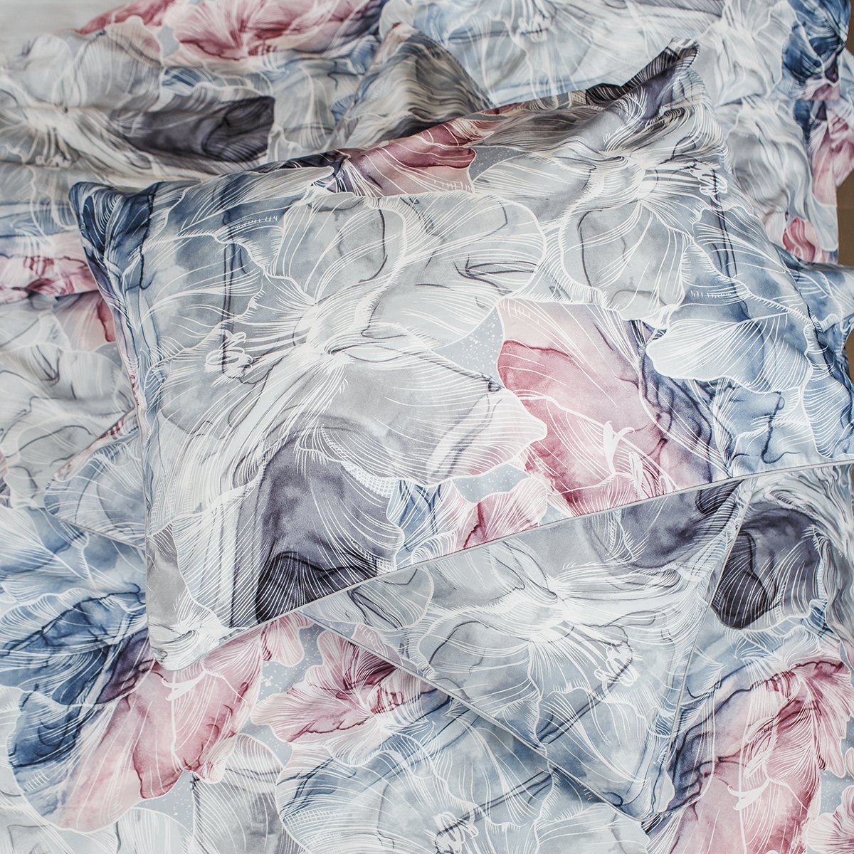 - Наволочки двухсторонние: лицевая сторона – абстракция, оборотная – однотонная. Декоративный кант по трем сторонам наволочки. Широкий запах на наволочках - легко менять подушки.