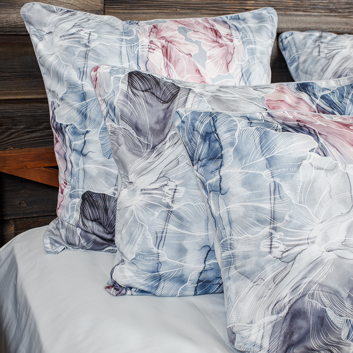 Изящный, будто воздушный, комплект воплощает в себе чарующую романтику, хрупкую красоту и элегантность. Нежное сочетание розово-голубых оттенков, стильно дополненное изящным и легким флористическим орнаментом, словно погружает нас в мир сказочных грез. Неповторимый стиль и гармония вашего интерьера.