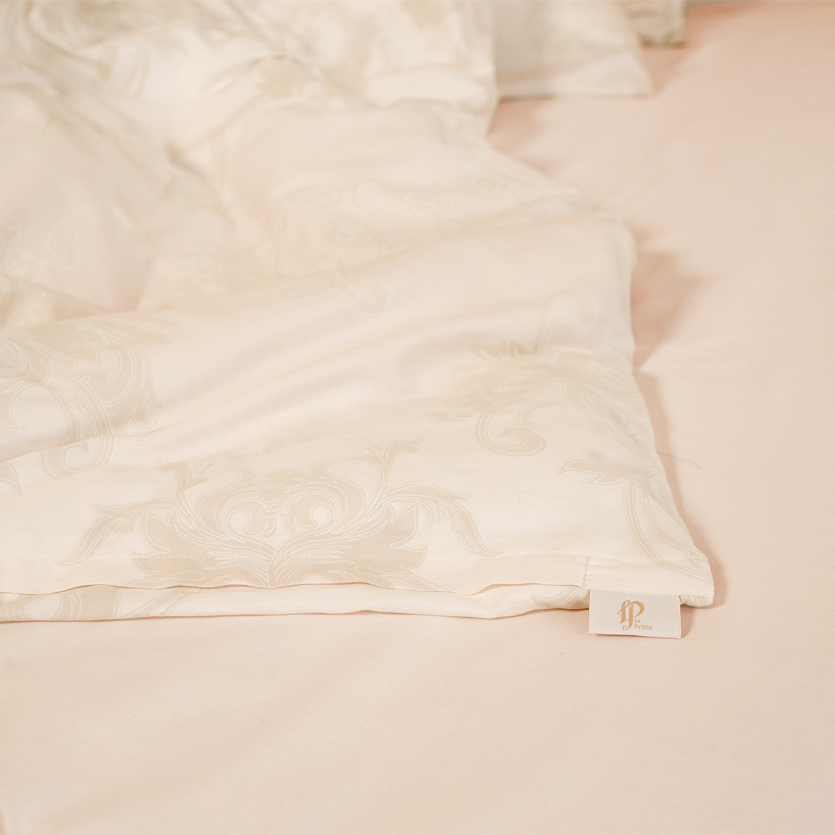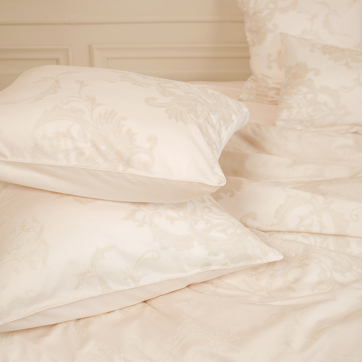 Элегантное созвучие классических форм – изысканные, тонко выписанные линии дамасского орнамента и мягкий пастельный фон. Особую изысканность комплекту придает роскошный градиентный переход от нежно-сливочного оттенка к более глубокому и насыщенному нюдово-песочному цвету.