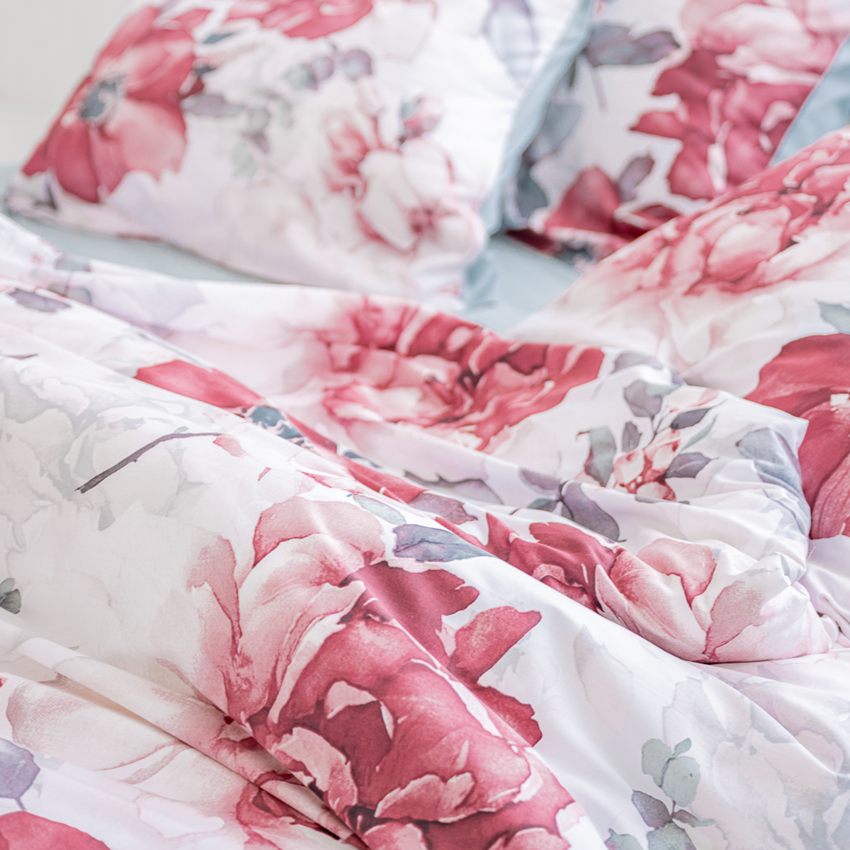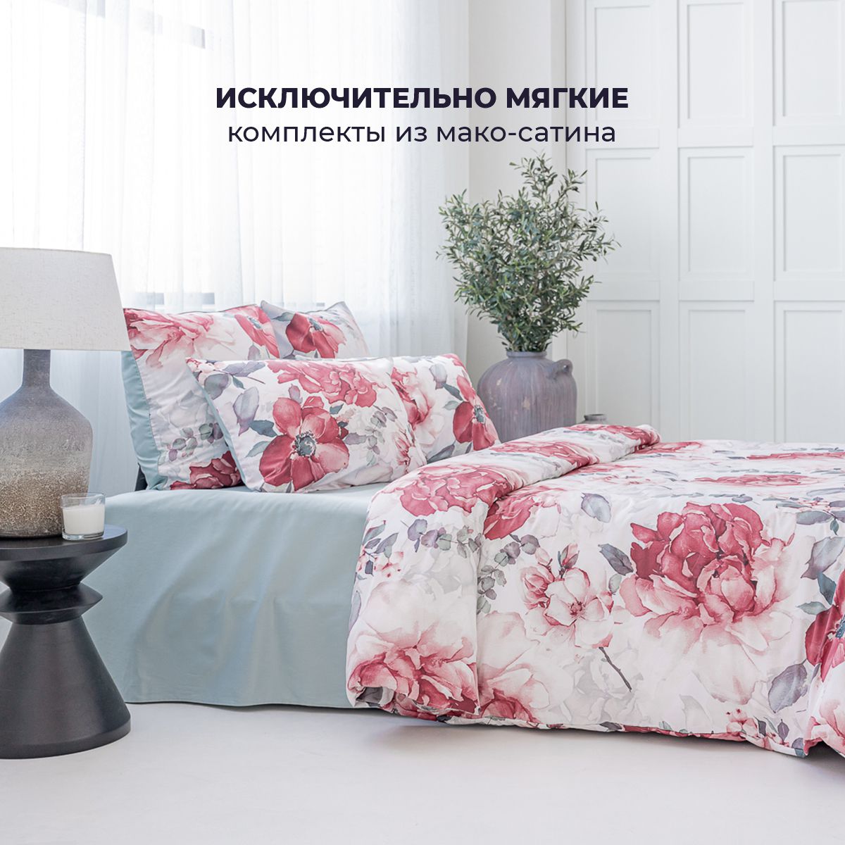 Эффектный акварельный принт, созданных искусным художником. Яркая и сочная красота крупных бутонов чарует и манит… Изящество и нежную красоту роскошного дизайна подчеркивает нежный белоснежный фон комплекта.