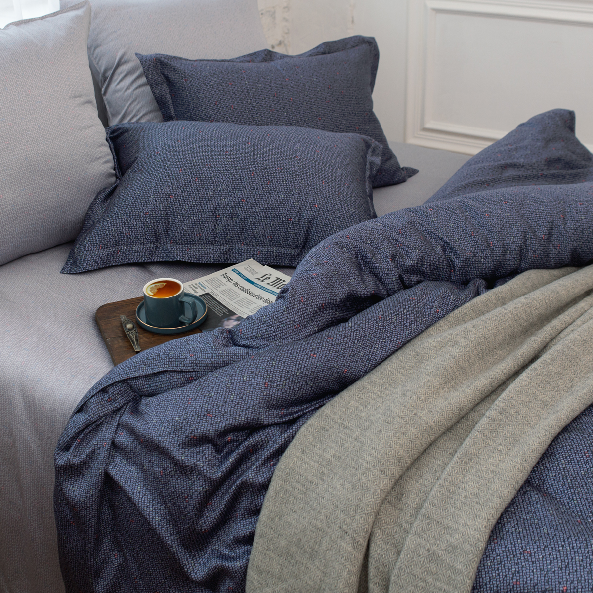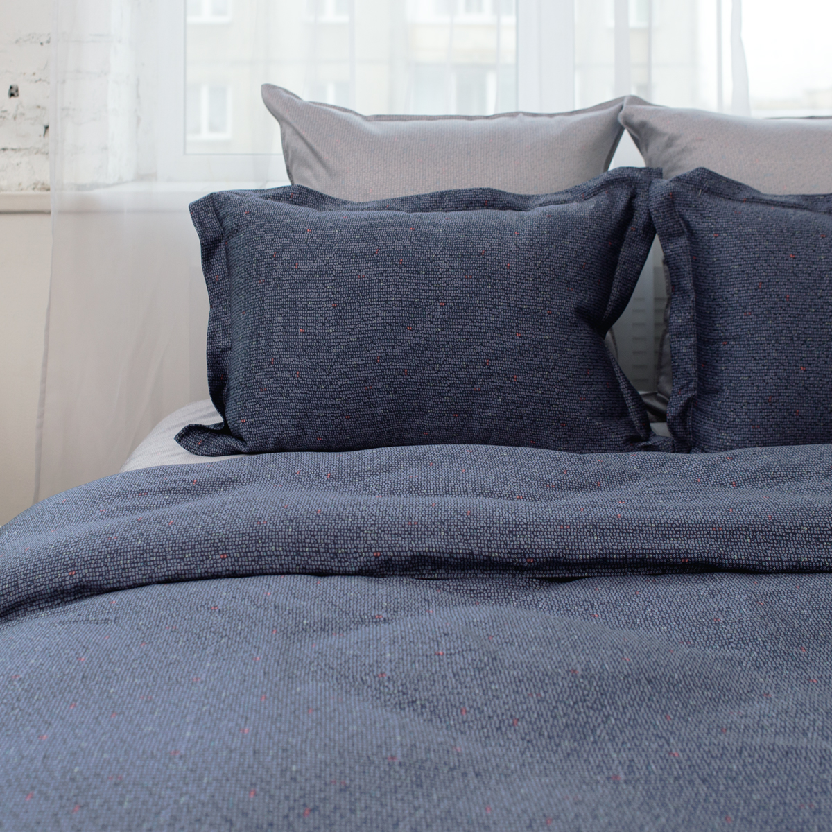 Неповторимая глубина благородного синего оттенка в сочетании с универсальным серым - строгая и ультрамодная контрастность выгодно подчеркнет индивидуальность и украсит интерьер спальни.