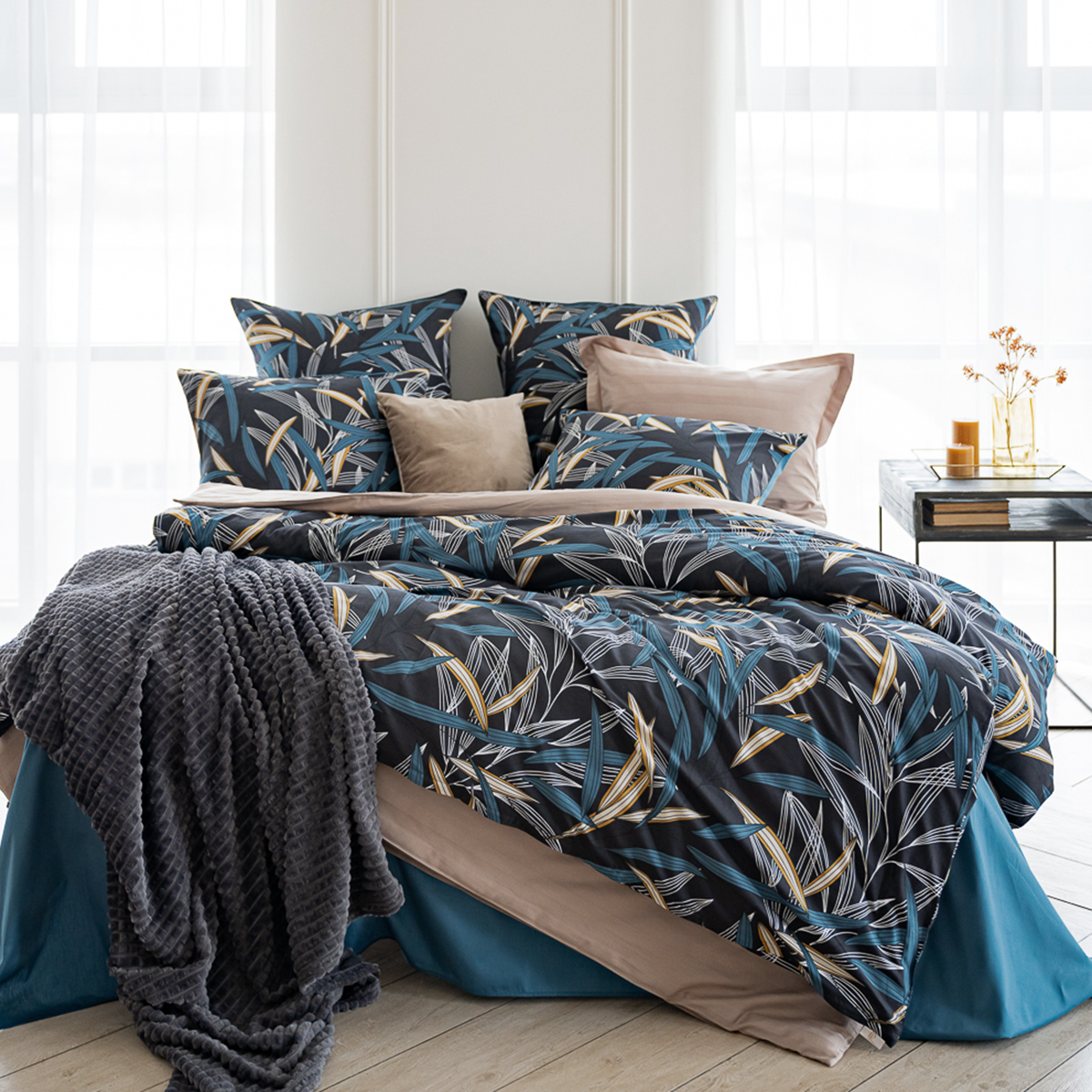 - Наволочки двухсторонние: лицевая сторона– растительный принт, оборотная – однотонная. Декоративный кант по трем сторонам наволочки.