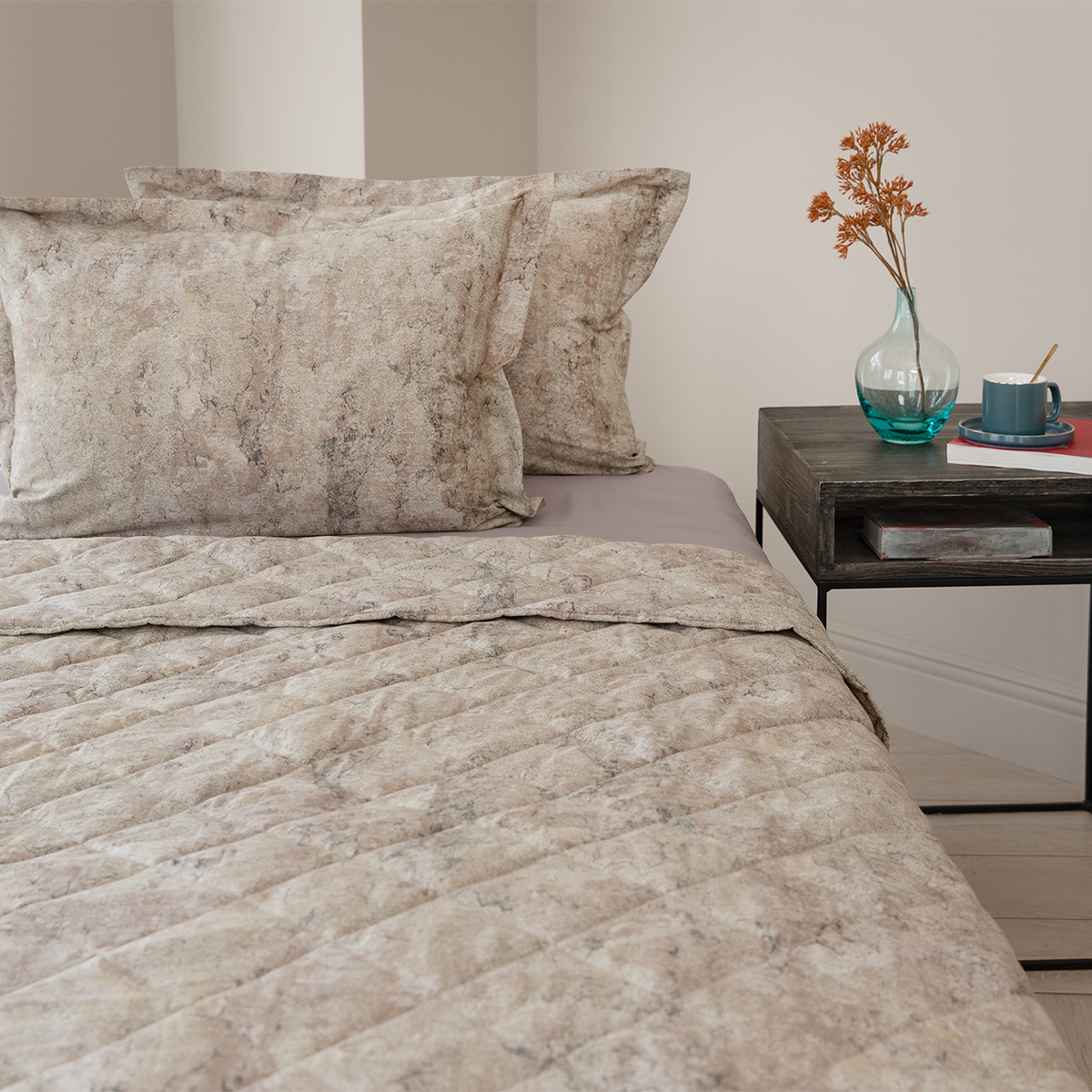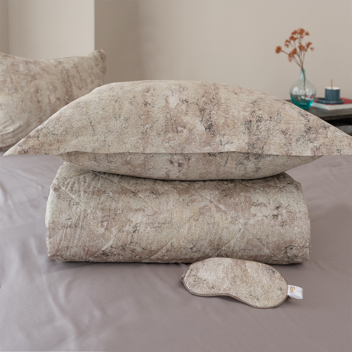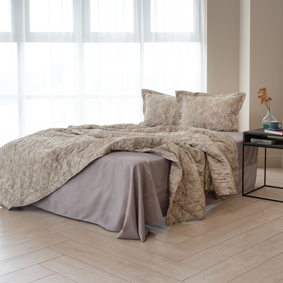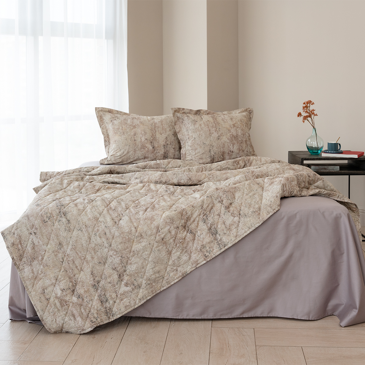 Стильный и необычный дизайн он будто повторяет текстуру натурального камня. Особую элегантность дизайну придает мягкое сочетание оттенков от светло-бежевых тауповых до насыщенный серых тонов. Одновременно универсальное и изысканное украшение спальни. Эксклюзивные печатные принты созданы в собственной дизайн студии La Prima.