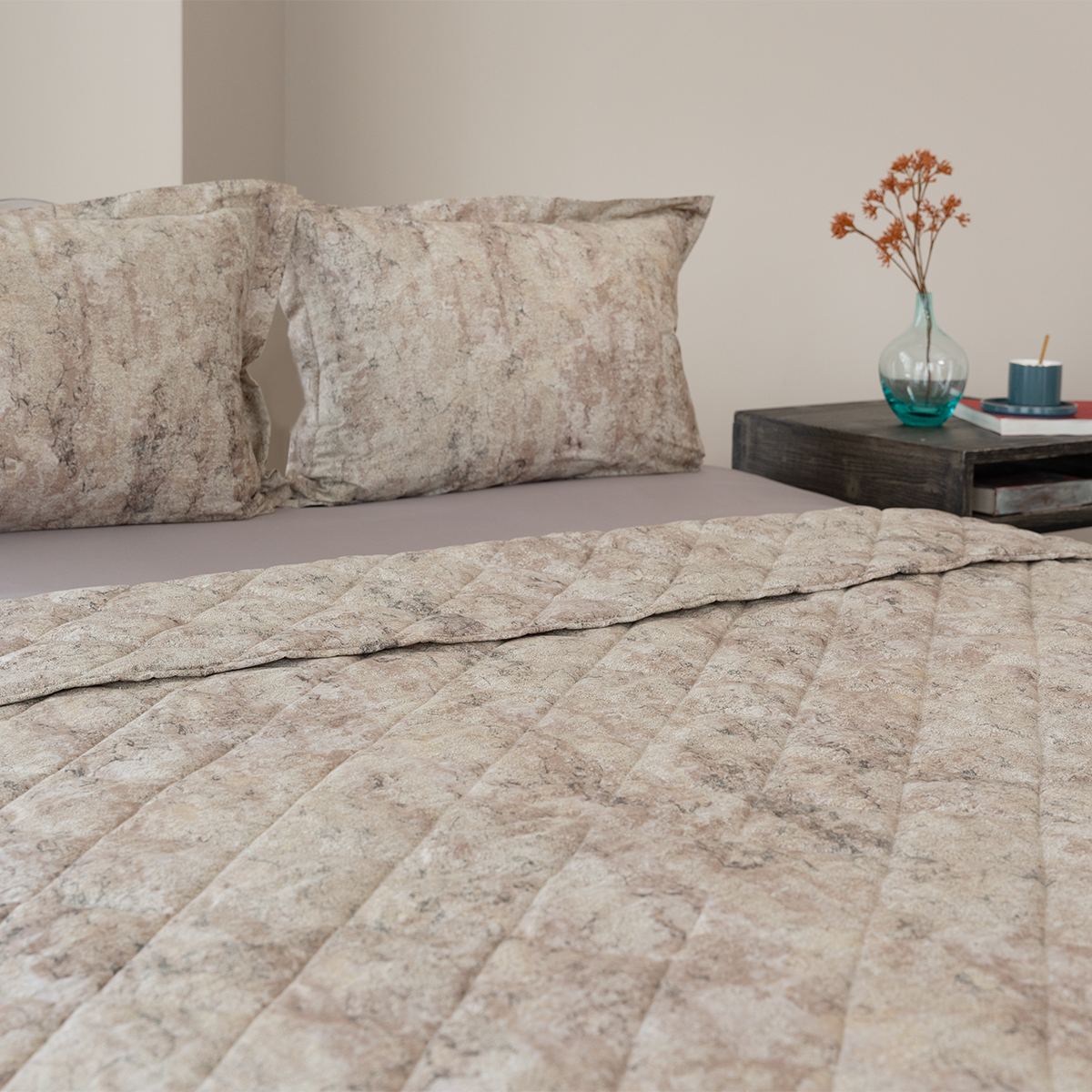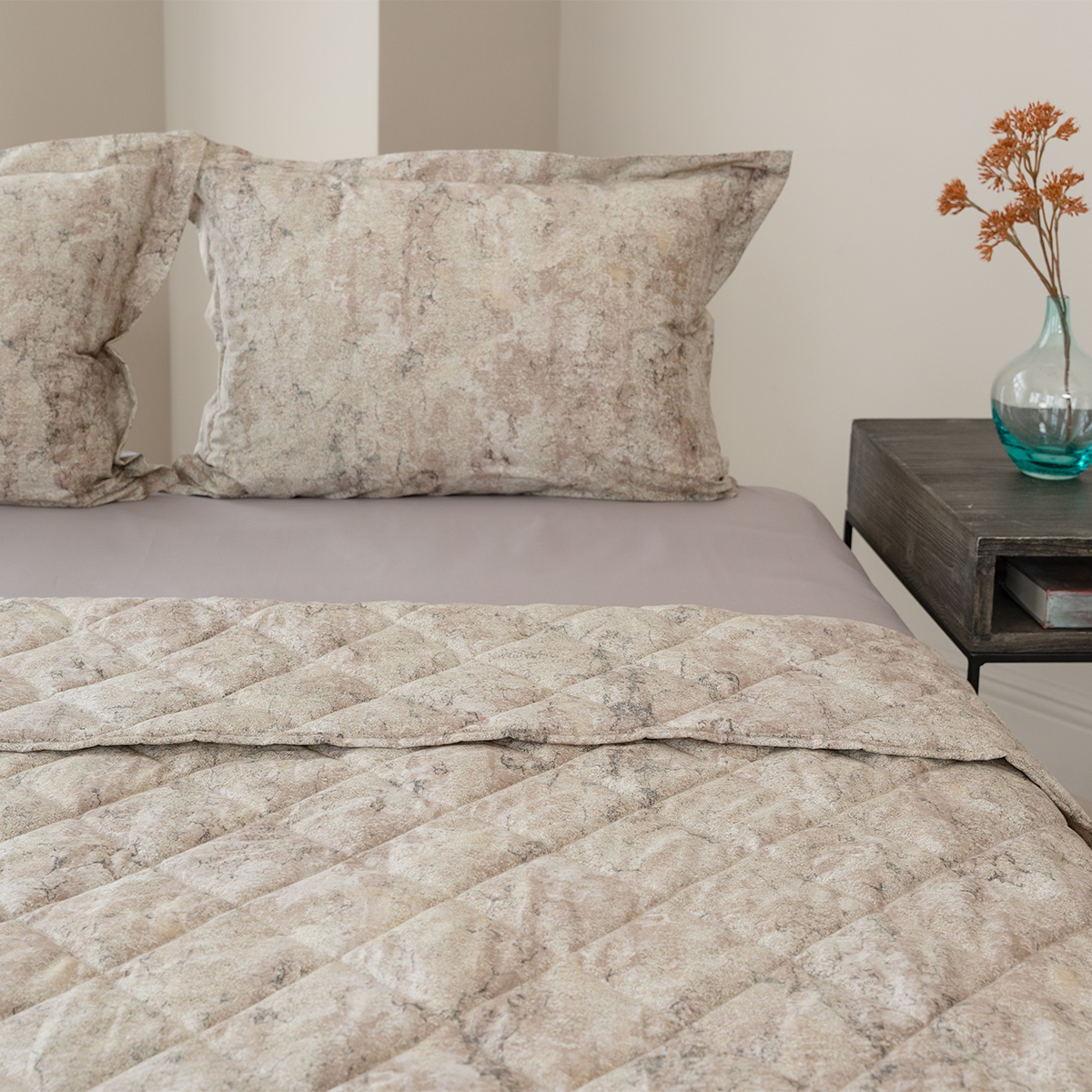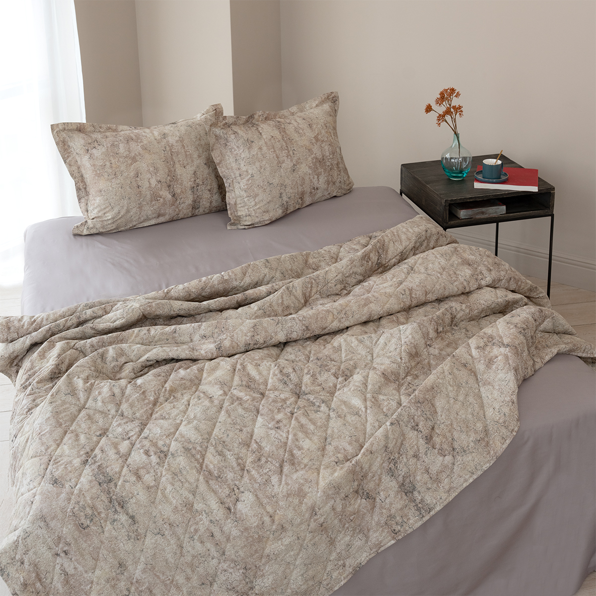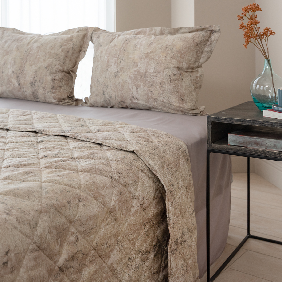 Стильный и необычный дизайн он будто повторяет текстуру натурального камня. Особую элегантность дизайну придает мягкое сочетание оттенков от светло-бежевых тауповых до насыщенный серых тонов. Одновременно универсальное и изысканное украшение спальни. Эксклюзивные печатные принты созданы в собственной дизайн студии La Prima.