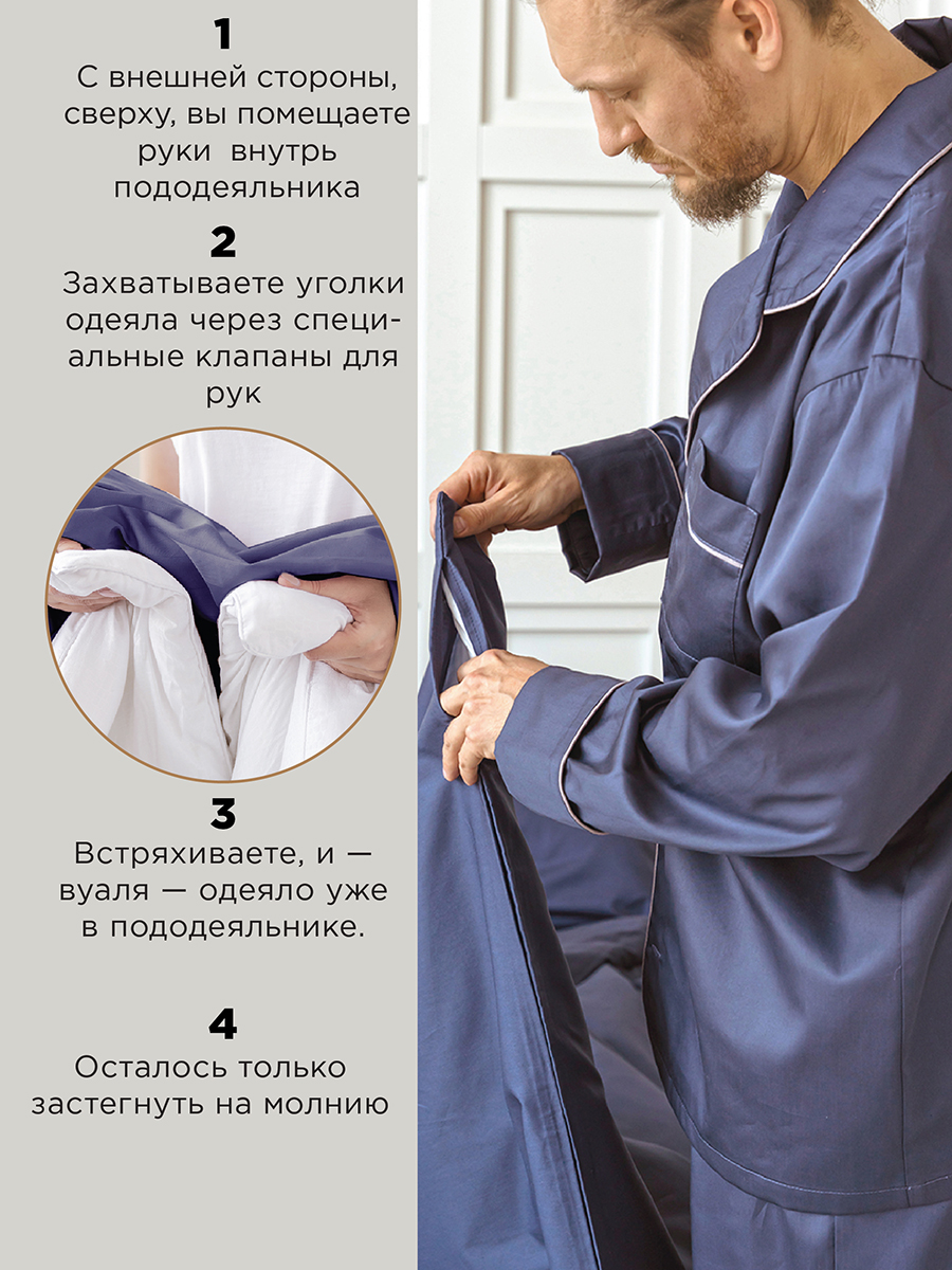 ПОДОДЕЯЛЬНИК С КЛАПАНАМИ ДЛЯ РУК — это то, с чем вы перестанете тяжело вздыхать при вдевании одеяла. Молния во всю ширину пододеяльника в цвет комплекта. Как это работает: