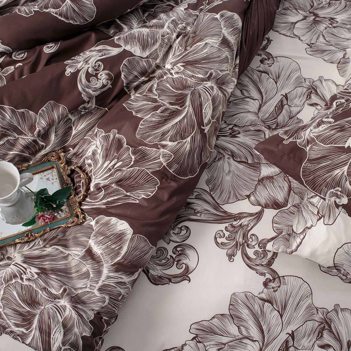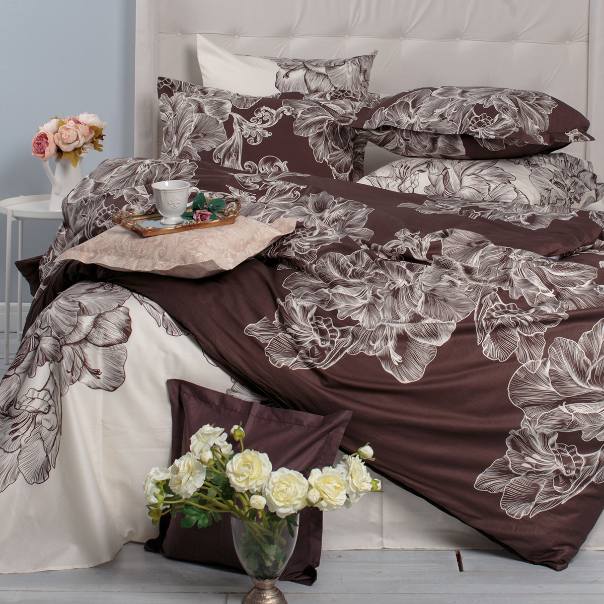 Сочетание оттенков темного и молочного шоколада – истинное удовольствие для гурманов, с послевкусием оригинальных тоновых композиций. Цветочный ансамбль исполнен в модной гравюрной технике.