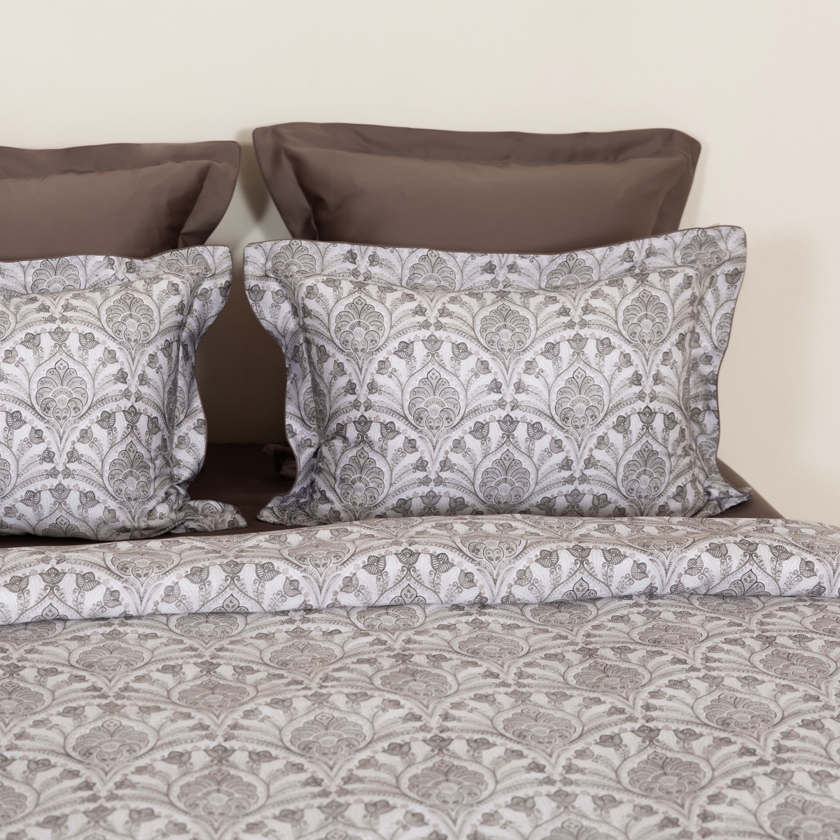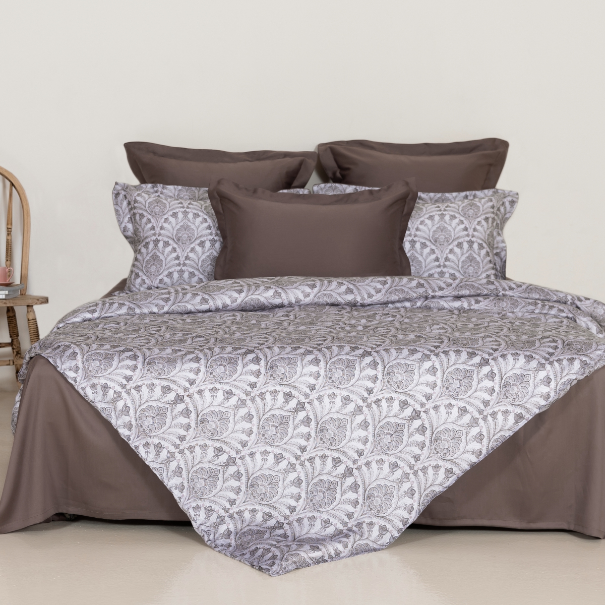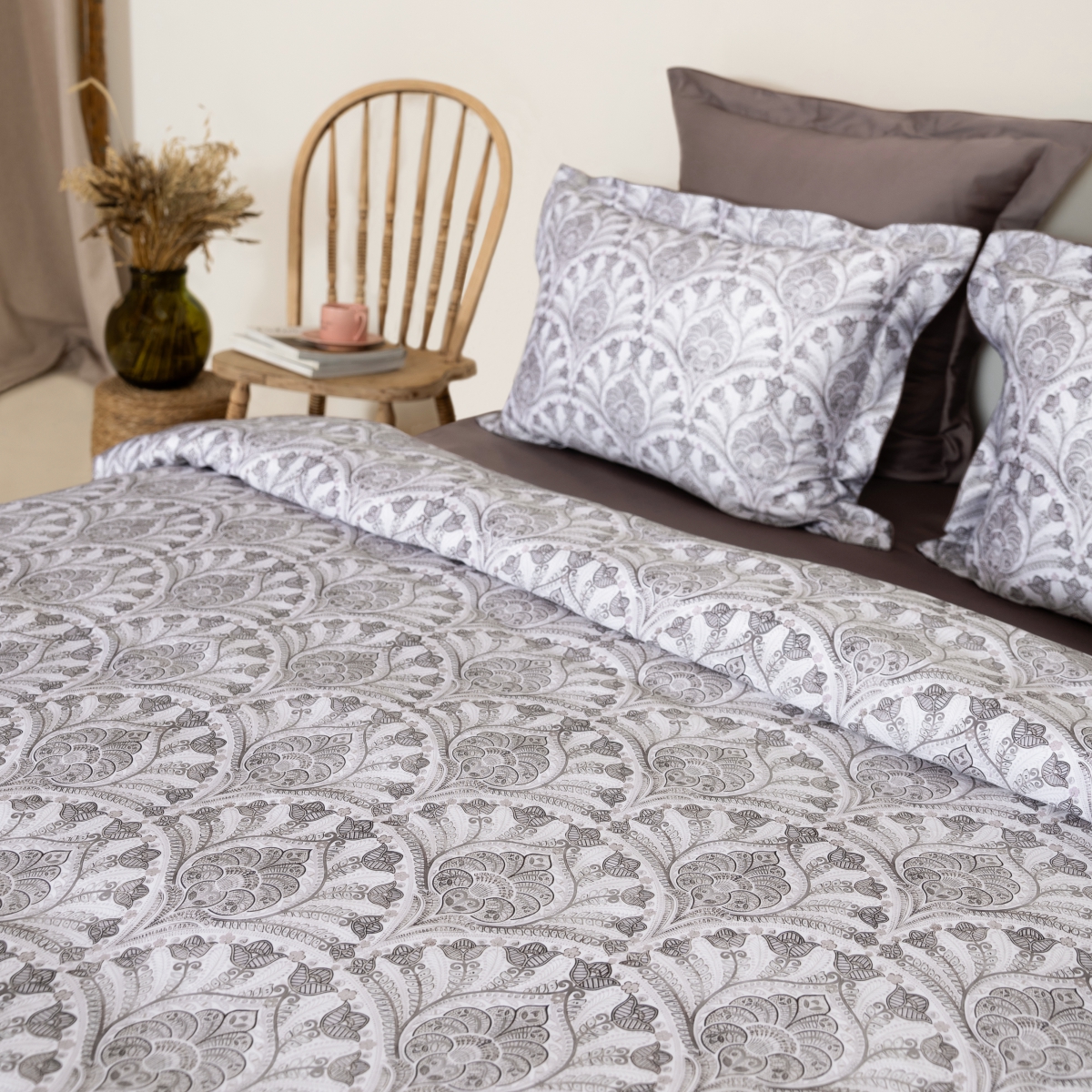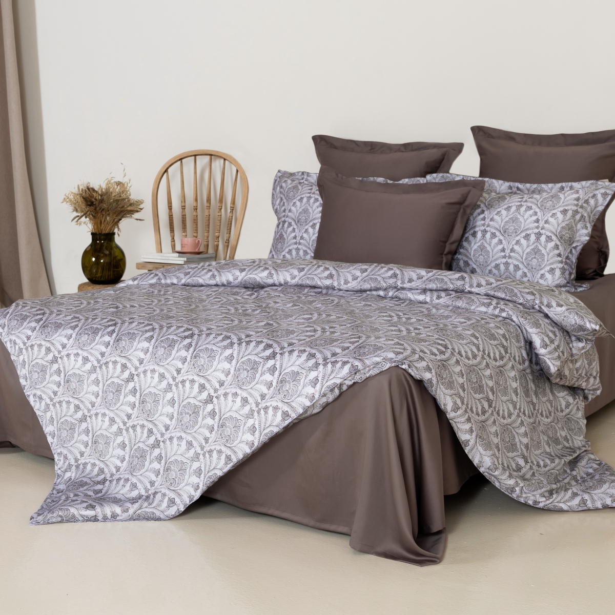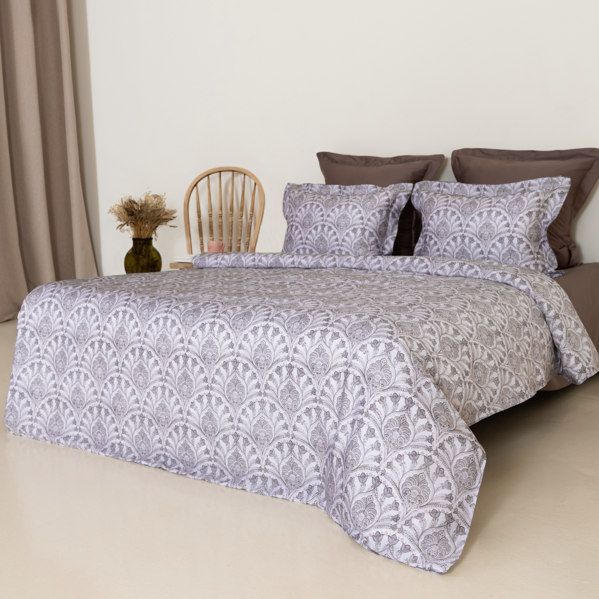 Дизайн постельного белья сочетает в себе утонченную элегантность и современные акценты. Принт с изысканным орнаментом в пастельных тонах создает атмосферу уюта и комфорта, а симметричные элементы в сочетании с мягкими цветами дарят ощущение гармонии. Роскошная текстура ткани придает особую воздушность, а глубокие оттенки в комбинации с мягким фоном превращают спальню в место для отдыха и восстановления. Этот набор идеально подходит для тех, кто ценит стиль, комфорт и нежность в каждой детали.