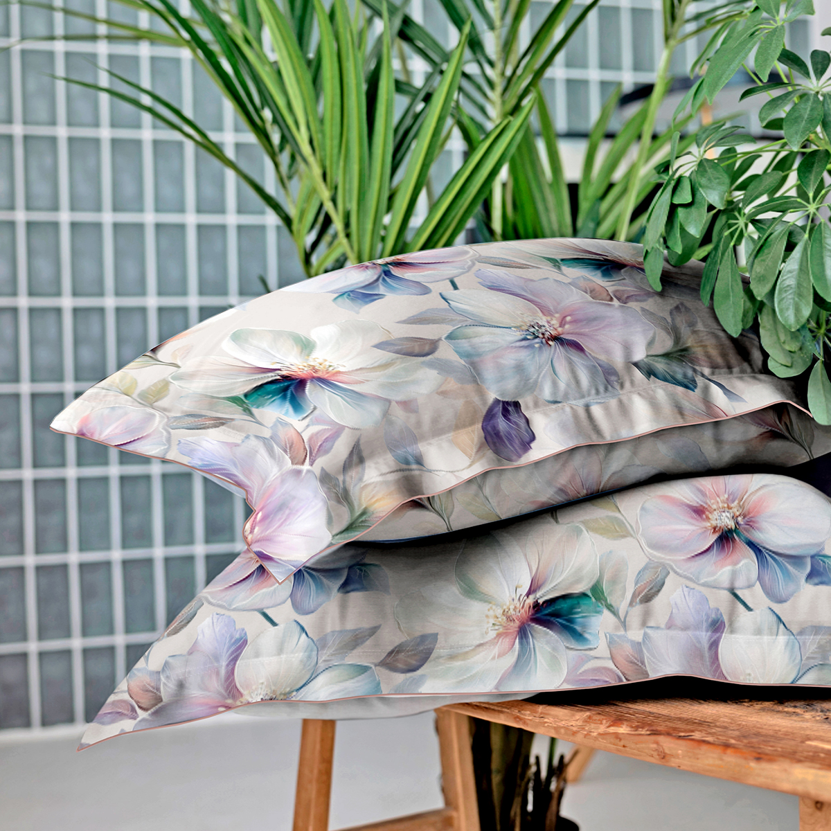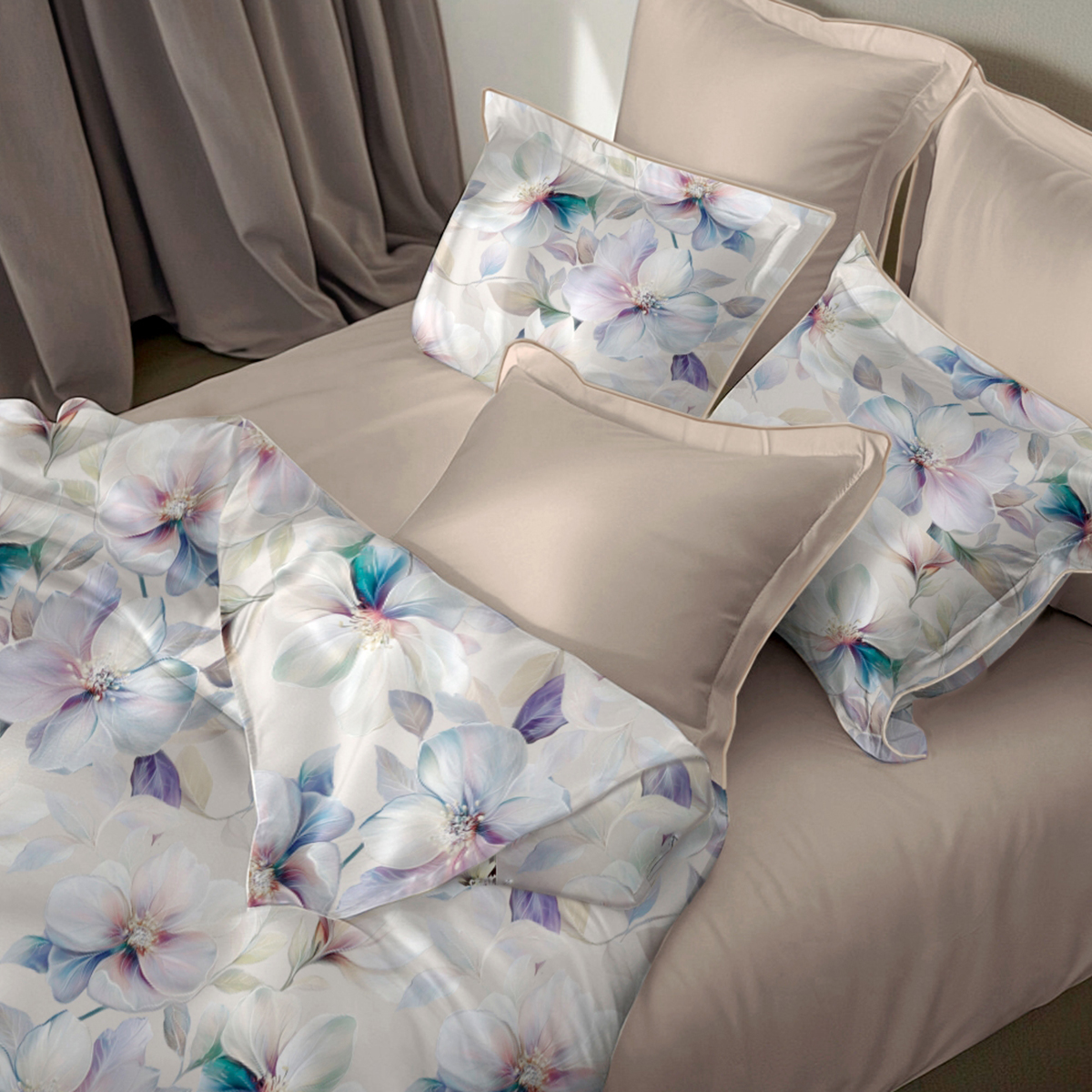Фьорелла. Постельное бельё с принтом из крупных нежных цветов словно окутывает спальню атмосферой весеннего сада, где каждый лепесток дышит мягкой элегантностью. Роскошные бутоны, будто написанные акварелью, раскинулись по ткани в свободном, но гармоничном танце, где сон становится похож на погружение в живую картину.