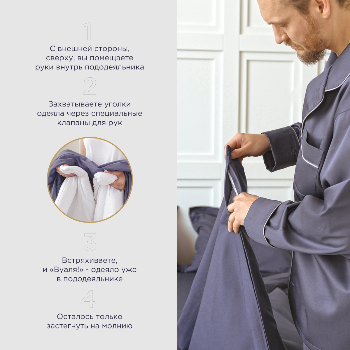 - Встряхиваете одеяло и улыбаетесь, ведь оно уже в пододеяльнике!