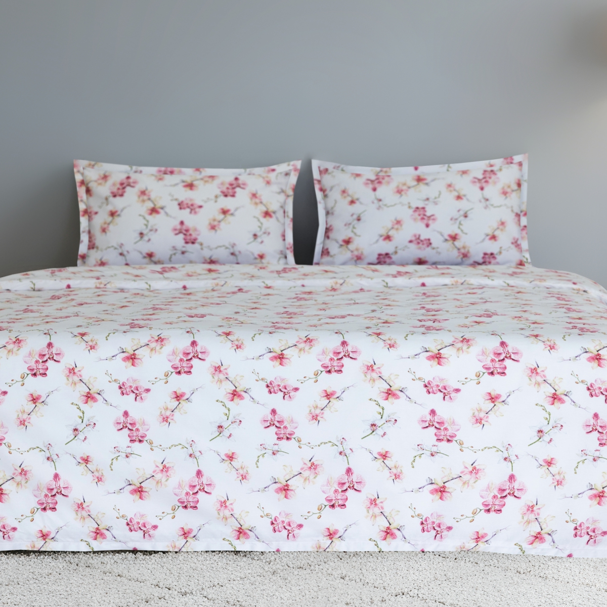 Дизайн «Этюд» - представьте утро, когда за окном — осенняя дымка, а в вашей спальне — по-летнему светло. Идеально белый фон комплекта, как первый искристый иней, отражает свет и наполняет комнату ощущением чистоты и простора. А утонченные орхидеи, застывшие в шелковистой глади сатина, — это напоминание о вашей собственной изысканности и внутренней силе.