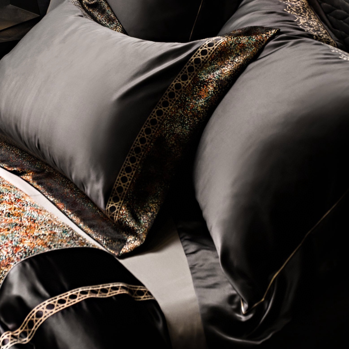 Особое внимание уделено дизайну. Эксклюзивный дизайн, разработанный в Дом Моды «Аника Керимова», подчёркивает неповторимость серии «Орелио». Мозаичный принт с разноцветными вкраплениями и ажурный кант с геометрическим узором стали акцентом коллекции и символом аристократичной изысканности. Благодаря двустороннему исполнению комплект легко меняет атмосферу спальни — от утончённой гармонии до выразительной декоративности.