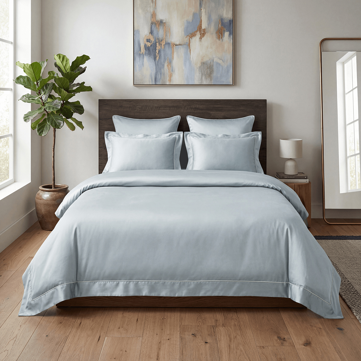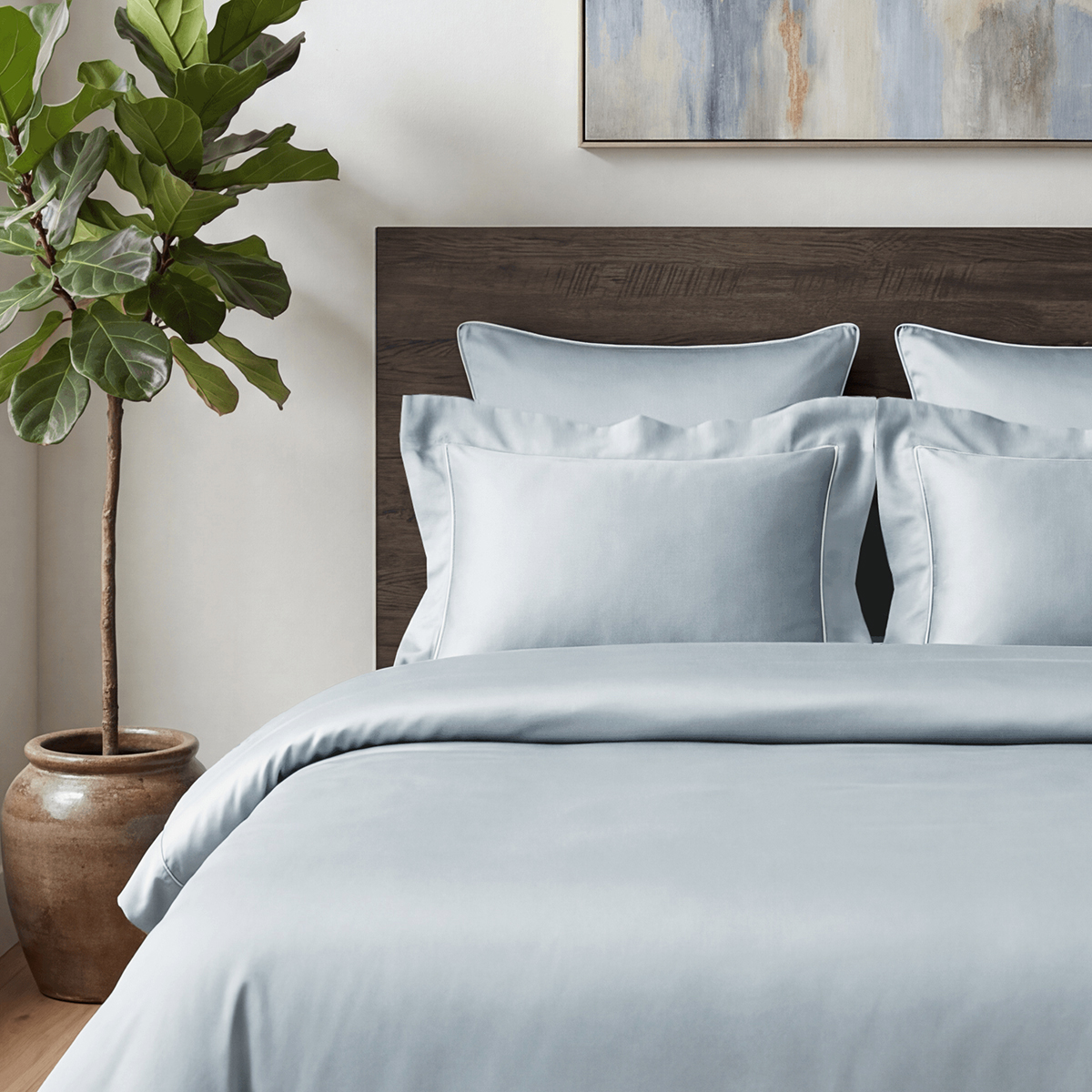 Редкий длинноволокнистый хлопок: нити прочнее и тоньше обычного, поэтому ткань не пиллингуется и не теряет форму. Сатиновое плетение создаёт живое сияние, как у шёлка, но с комфортом дышащего хлопка. Не электризуется, не скользит, приятен к телу. Выдерживает 500+ стирок без потери яркости и мягкости.