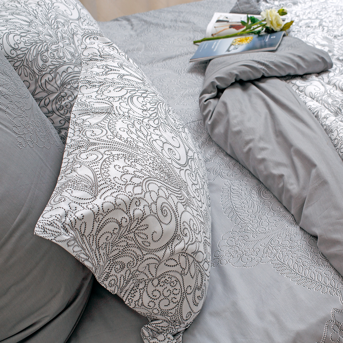 Сочетание двух монохромных оттенков и стильного, необычного орнамента превращает такое постельное белье в одновременно универсальное и изысканное украшение спальни. Наполняет пространство спокойствием, умиротворением и ощущением стабильности, смотрится нарядно и в тоже время сдержанно.