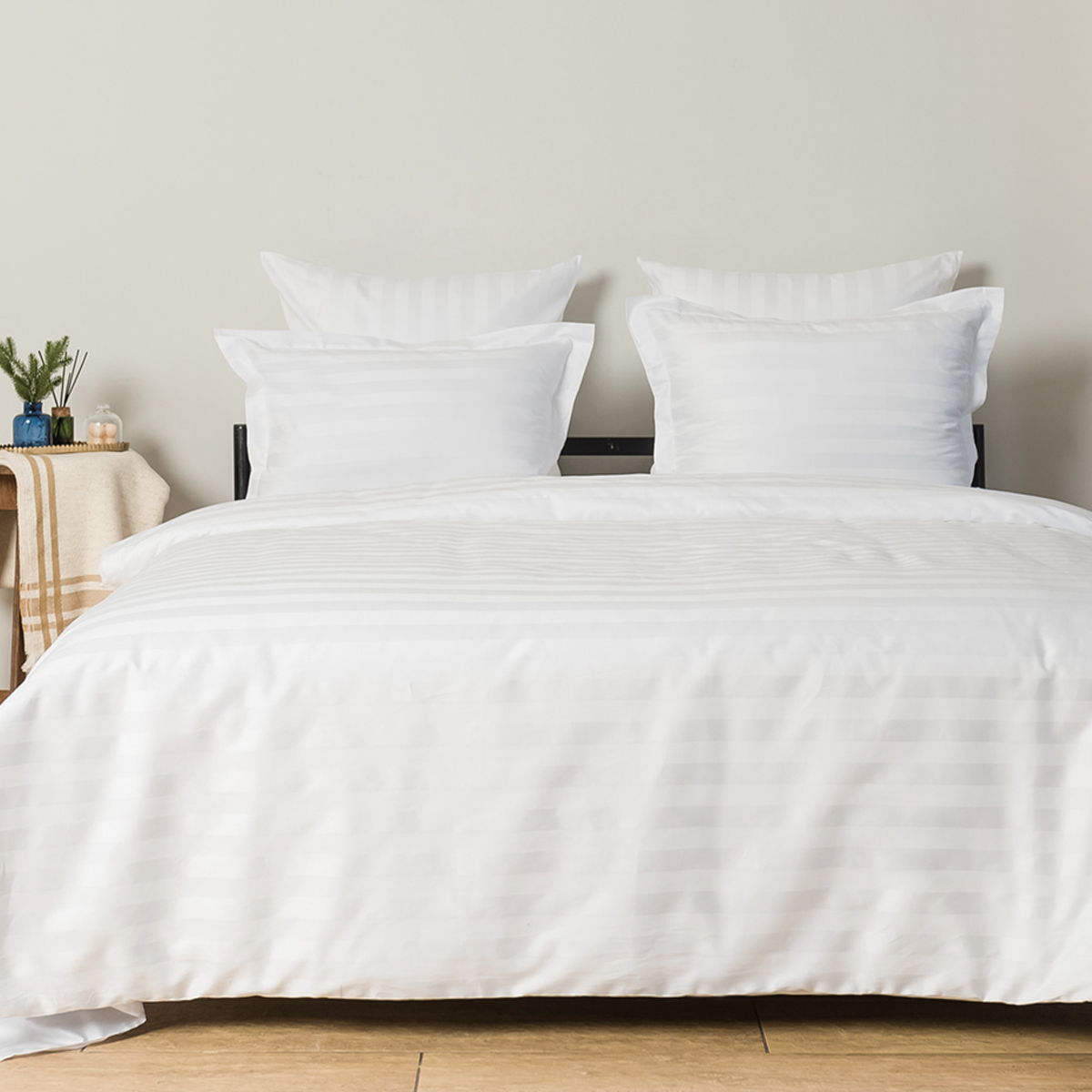 Однотонный стильный пододеяльник произведен из ткани страйп-сатин – 100% хлопок с жаккардовым рисунком в виде полос 3х3.