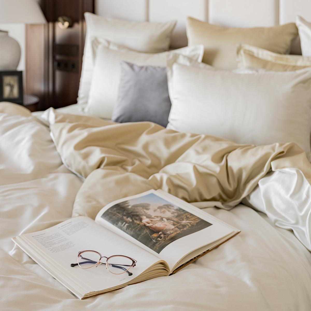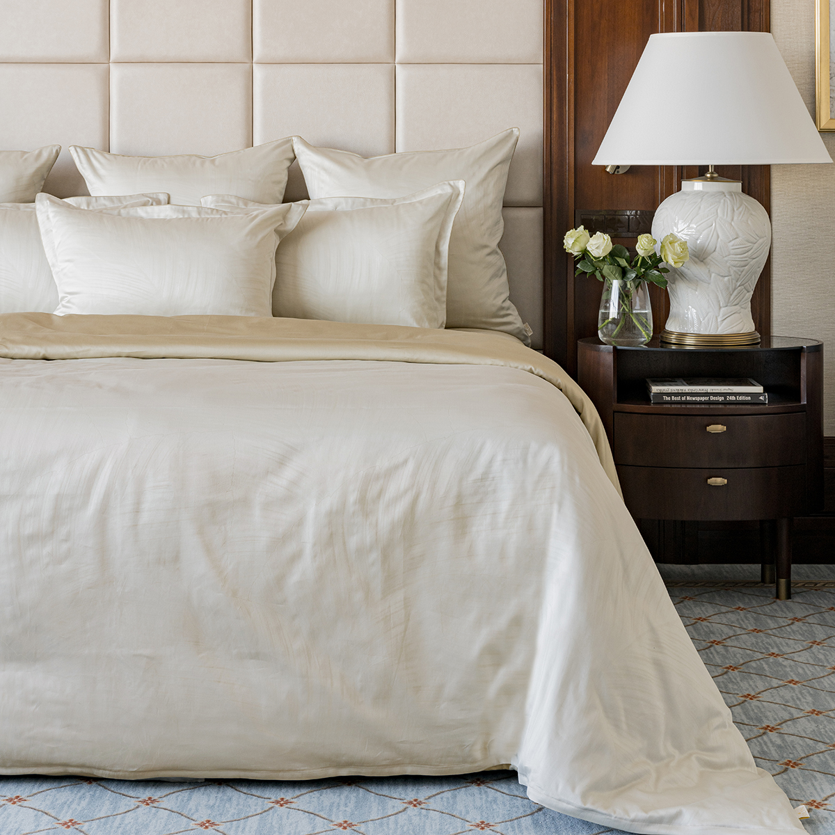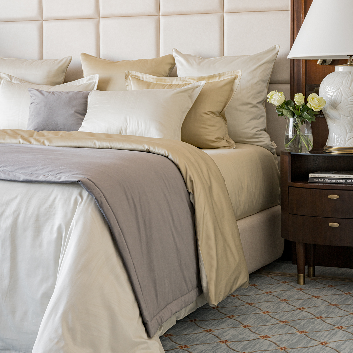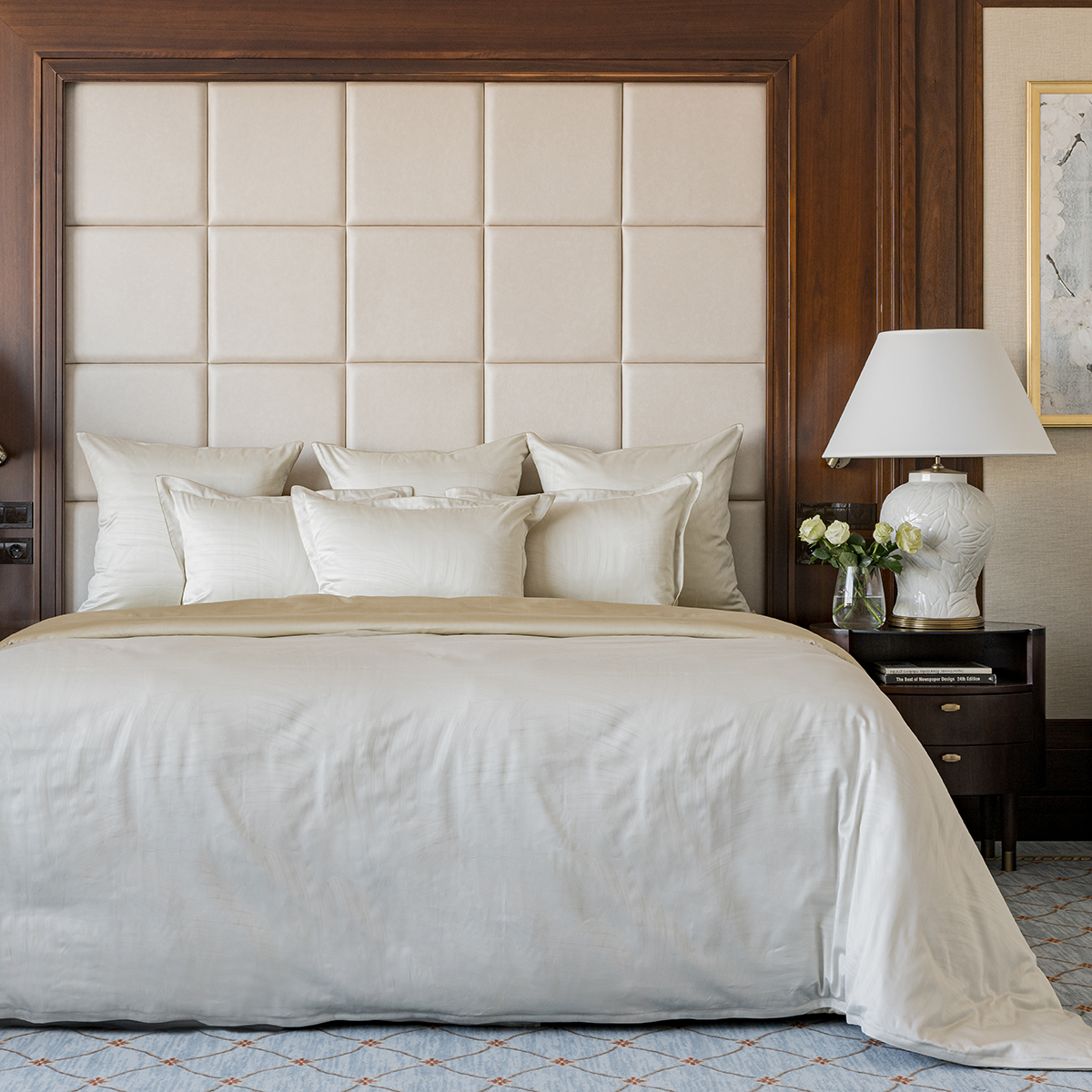 • Лицевая сторона наволочек и пододеяльника выполнена из жаккардовой ткани, оборотная из премиального длинноволокнистого хлопка сорта Пима