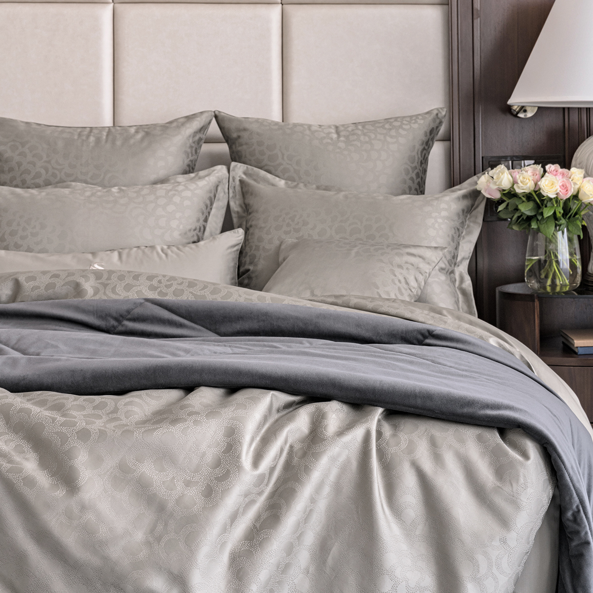 • Лицевая сторона наволочек и пододеяльника выполнена из роскошного жаккарда, оборотная из однотонного хлопка сорта Pima