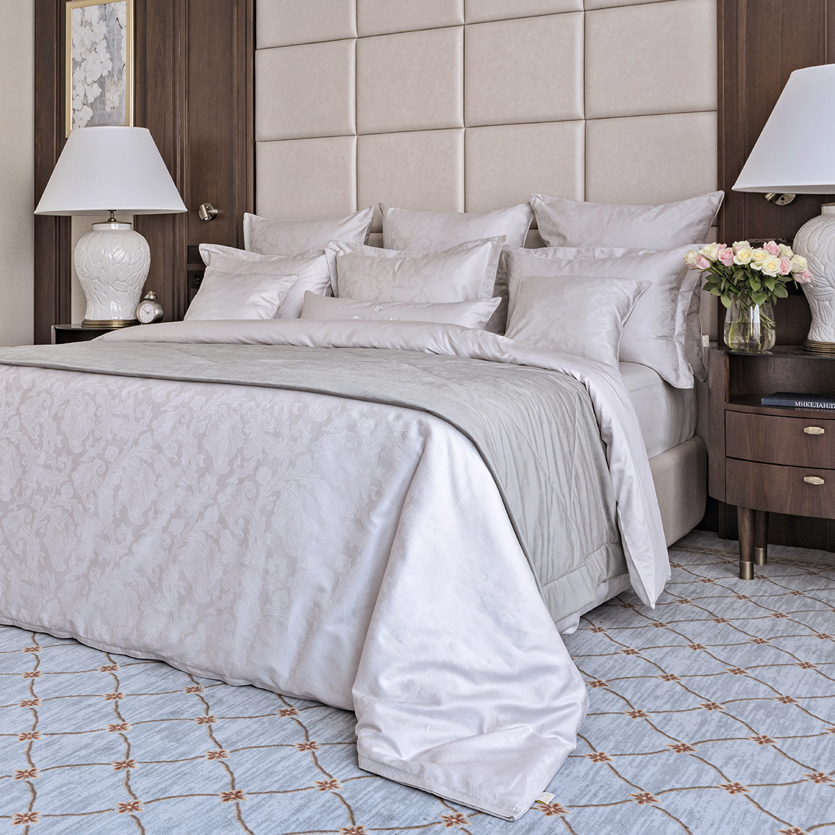 - Лицевая сторона наволочек и пододеяльника выполнена из роскошного жаккарда, оборотная из однотонного хлопка сорта Pima