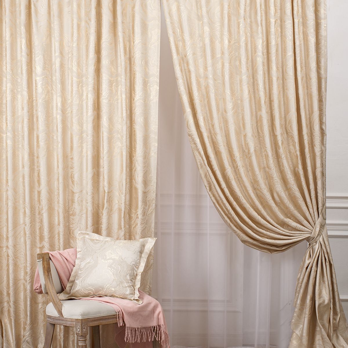 Готовые шторы отшиты на ленте – её можно стягивать и подстраивать под размер окна. Шторная лента, в свою очередь, является прекрасным помощником в создании объемной драпировки. Рекомендуемая длина карниза 250-300см. Низ штор обработан оверлоком для самостоятельного подгона изделия по высоте.